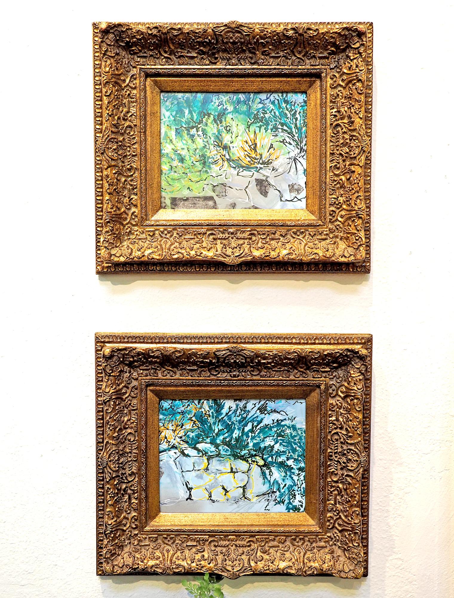 Mixed media drawings in vintage frames from artist residency in Maussane, France at the "Moulin" in 2024. Materials: Clairefontaine vert de gris paper with an acrylic wash, Sennelier oil pastels, chalk, B&W image transfers and Posca pens.