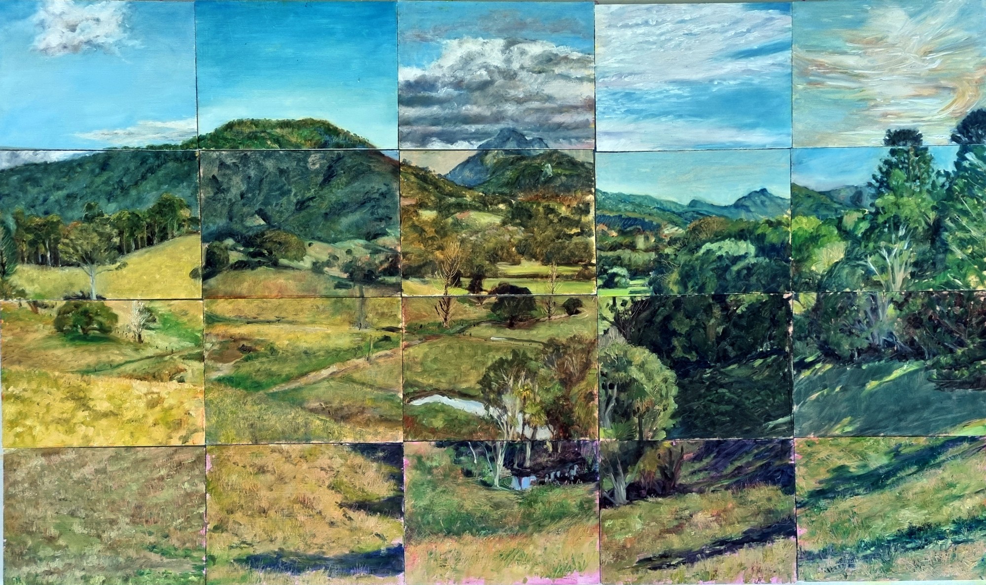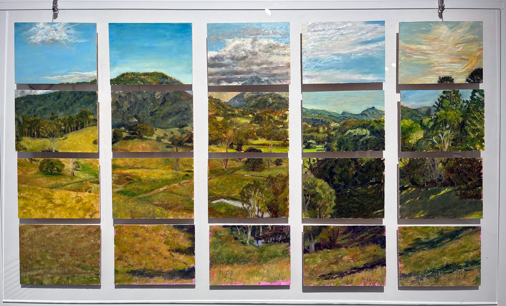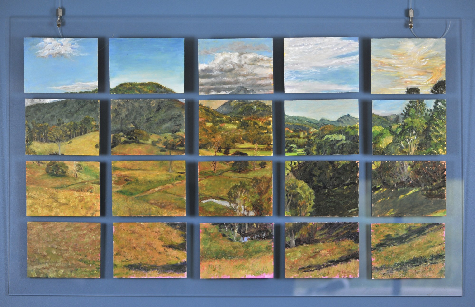 Made up of 20 individual 15 x 20 cm panels this panoramic view was painted over four weeks en plein air. The panels are attached to a perspex backing, raised at varying heights to give appearance of floating.