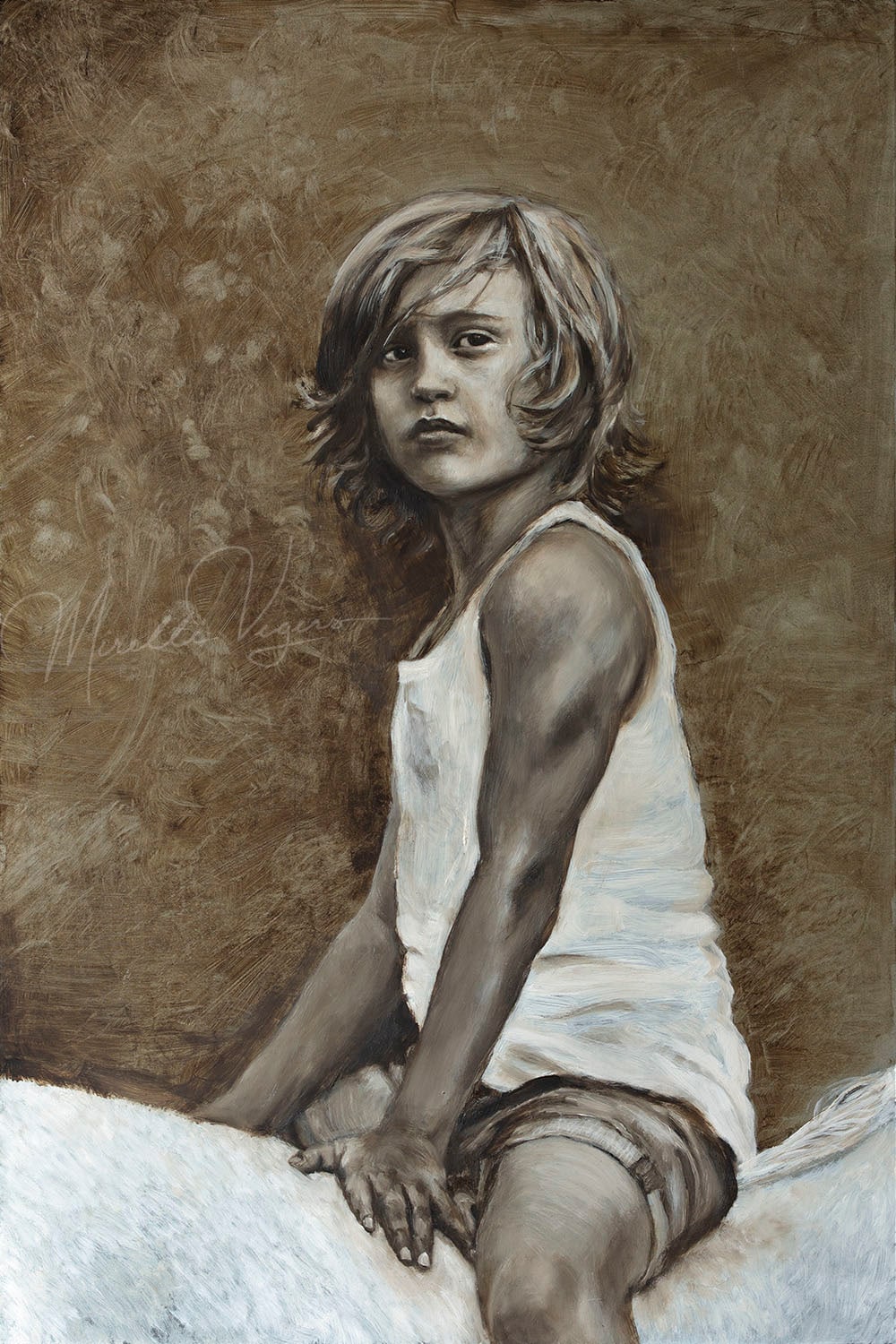 A monochrome painted portrait of a young boy. Seated backwards on horseback. The tone and setting refer to an old black and white film "Crin Blanc: Le Cheval Sauvage (1953)" about a friendship between horse and boy. It is painted on a galvanized steel plate. The metal shines through the brushstrokes, creating a different color from every angle, from brown to ocher to golden.