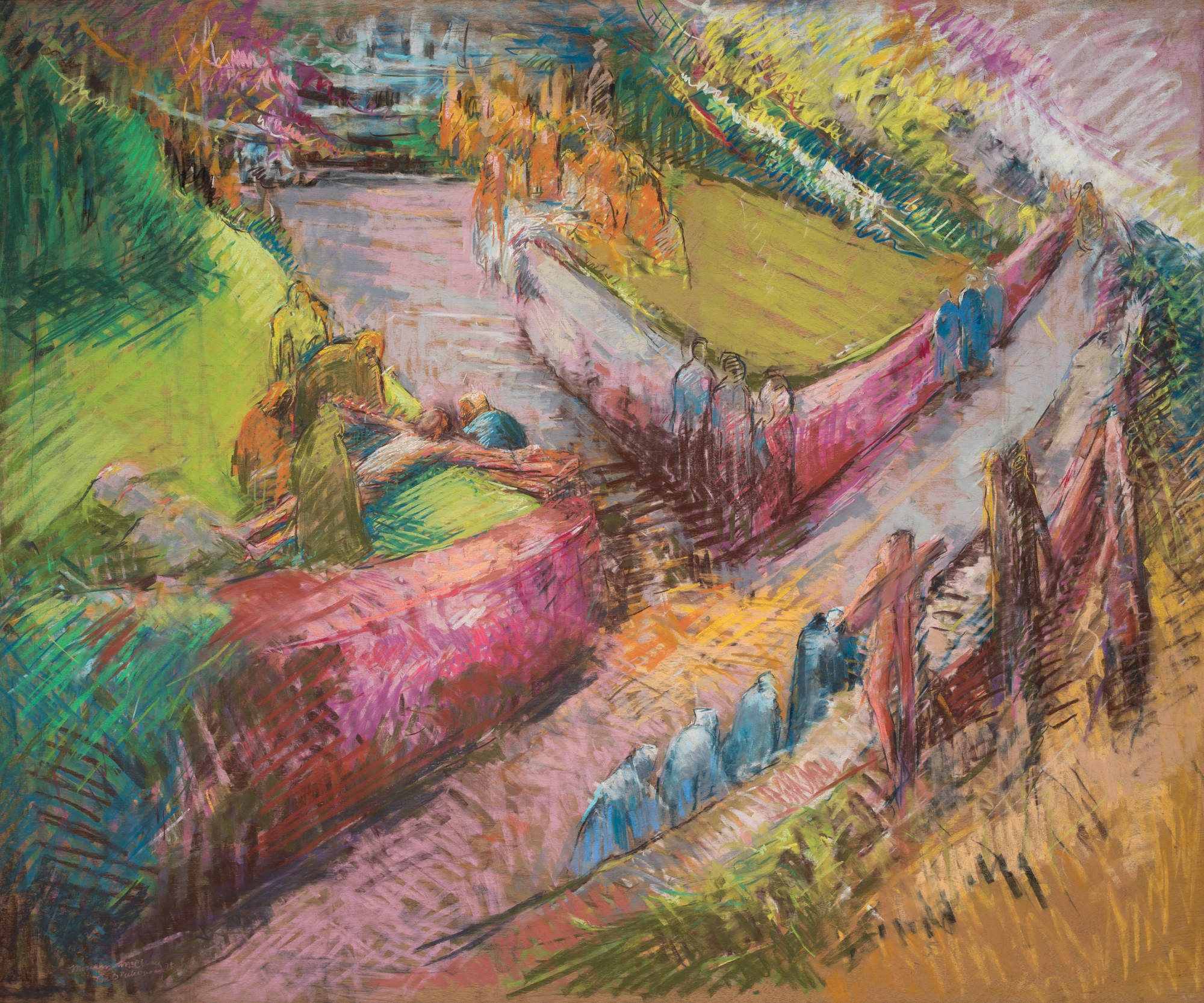 This was the most heart-rending piece of Miriam's Stations of the Cross series: the actual piercing of the nails. The pain is accentuated in the pastel by the clashing colors on green grass and Golgatha looming in the bottom right of the painting. The scene is set on Birmingham, Alabama's Cliff Road as the background for the work. This is one of 14 Stations of the Cross that took Miriam over a decade to complete.