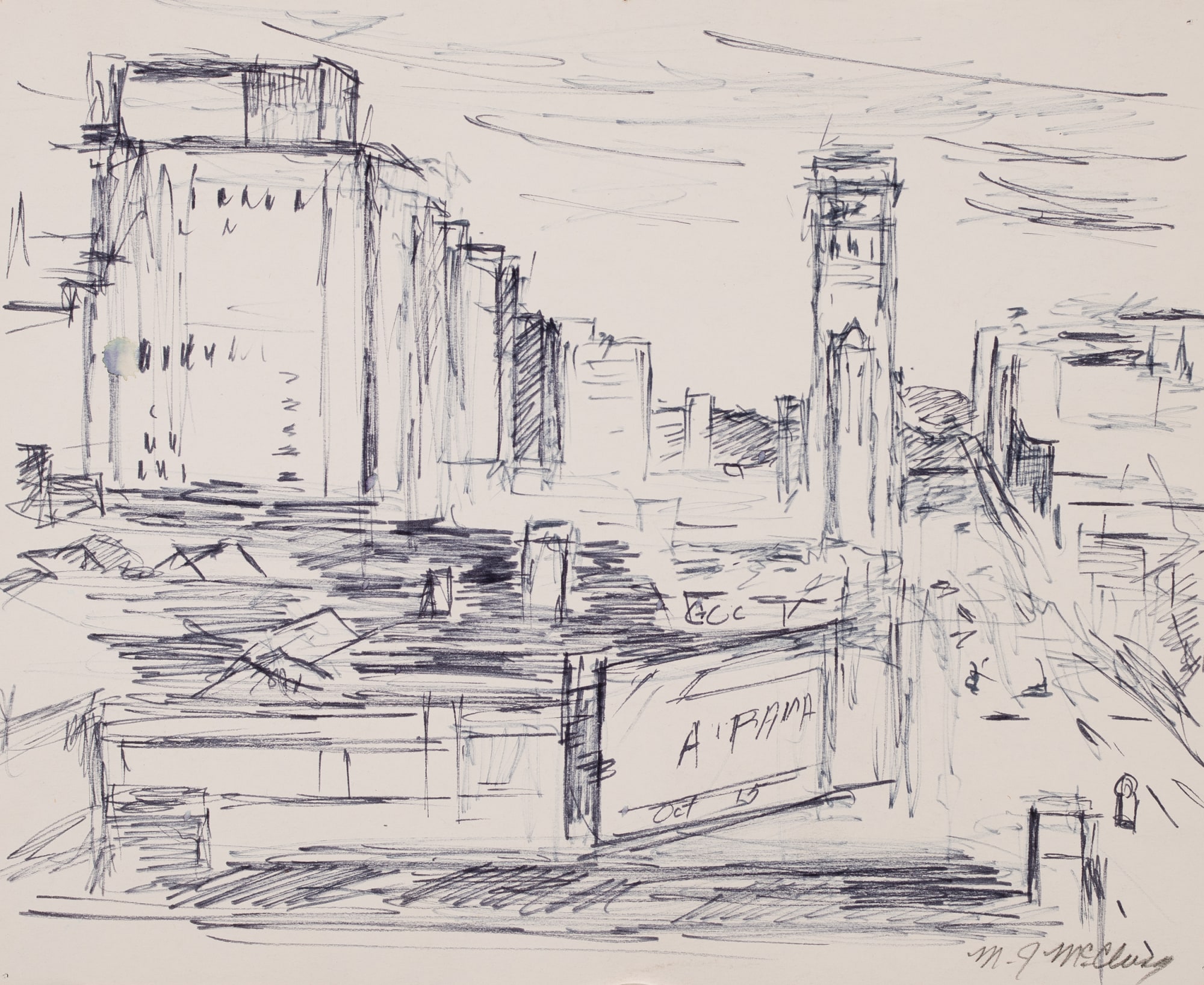 This early circa 1960’s drawing of downtown Birmingham, Alabama highlights the booming skyline with the historic 27-story City Federal/Comer Building built in 1913 in the distance. The perspective is looking north down what is now Richard Arrington Jr. Blvd (then 21st Street South) toward the heart of the city. The smaller buildings and homes as well as the wall with the “Alabama Oct 15” advertisement in the foreground have long since been demolished. This piece is one of the very few vintage drawings of downtown remaining in Miriam’s collection.