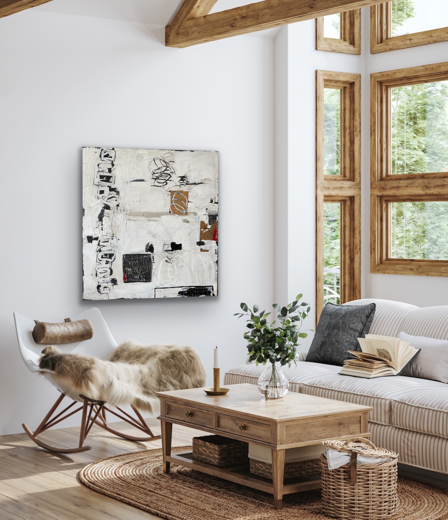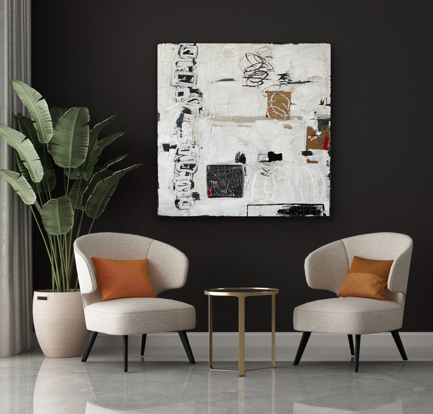 Description Original artwork by Miriam Traher. Cradled wood panel; 36x36”; This piece was created with acrylic paint, collage, graphite, and sgraffito, a form of expressive drawing, creating a vibrant, textured, geometric, bold, mixed media art to liven your walls and your place come alive. Collage and other mixed media are often incorporated, bringing depth and texture, and creating a complex yet simple artwork full of visual excitement. Framed in a wood panel this piece makes for a Modern, Abstract, Contemporary Artwork, Graphic, fun and dynamic, telling a story through art and form. Large art for large walls, white walls, textured, neutral and elegant for today's homes.