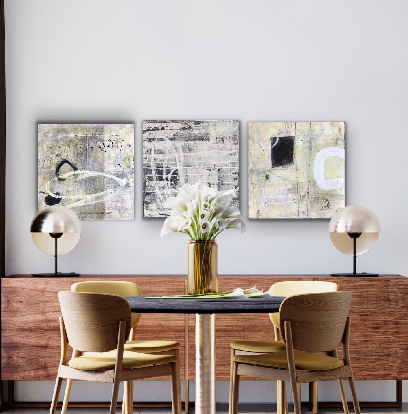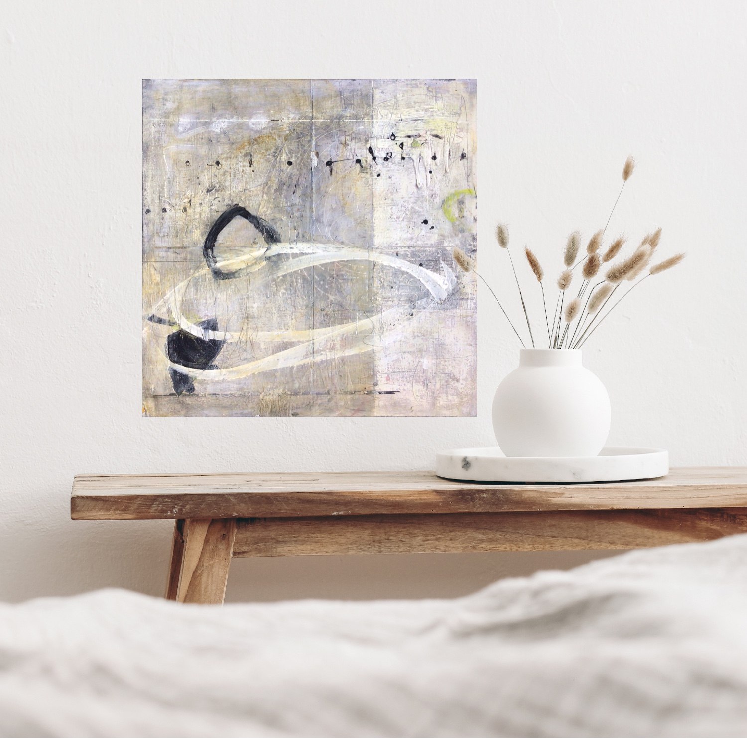 Exploring line and space, where the edges meet. Mixed media, collage, graphite, pencil. Miriam Traher is an intuitive artist, creating mixed media abstracts: led by color, shapes, marks and lines as they are layered and responded to. Her work is vibrant, expressive and full of visual texture, bringing life and joy to homes