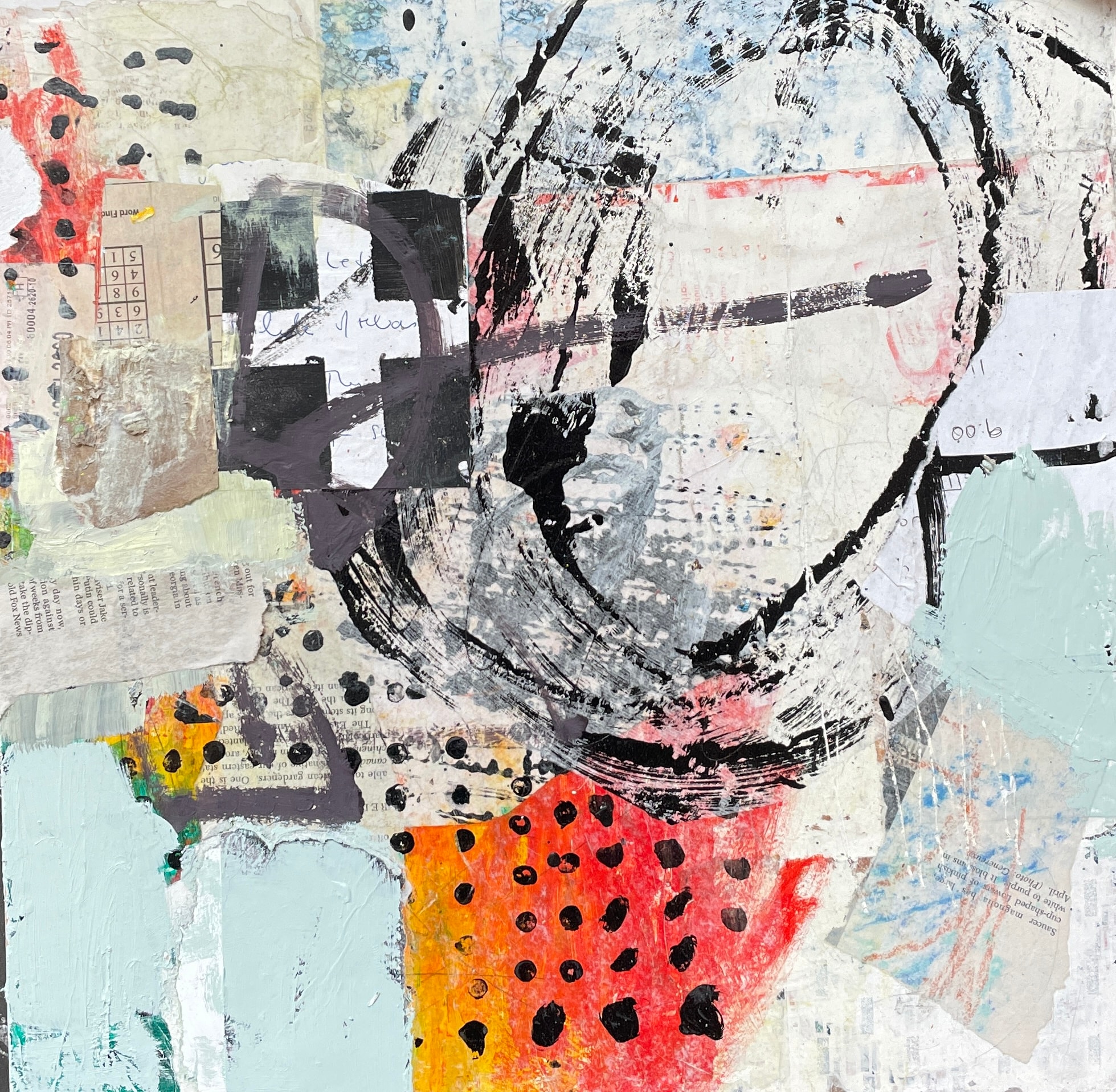 Exploring line and space where the edges meet—mixed media, collage, graphite, pencil. Miriam Traher is an intuitive artist, creating mixed media abstracts: led by color, shapes, marks and lines as they are layered and responded to. Her work is vibrant, expressive and full of visual texture, bringing life and joy to homes. The sides are natural hardwood.