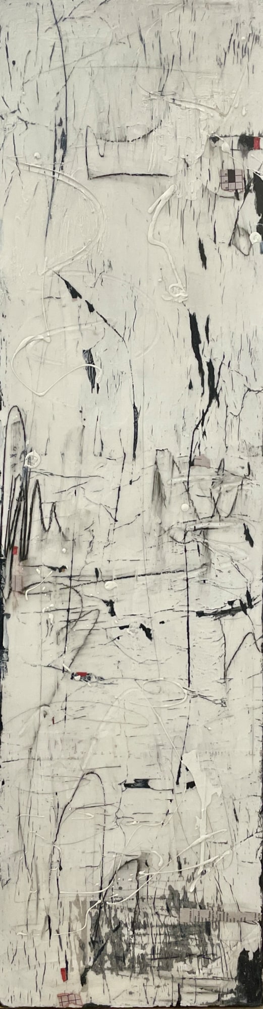 The process involves layering paint, collage, paint and more paint, layers and layers with colours, shapes and designs that are scraped, sanded, scratched and dug into, repainted, revealing and leaving bits of the past, the history of each layer. A story emerges that blends this history with the final design, which is rich in texture. The beauty is in the discovery, the rich surface and the hidden bits that can only be seen by getting in close and exploring its secrets.