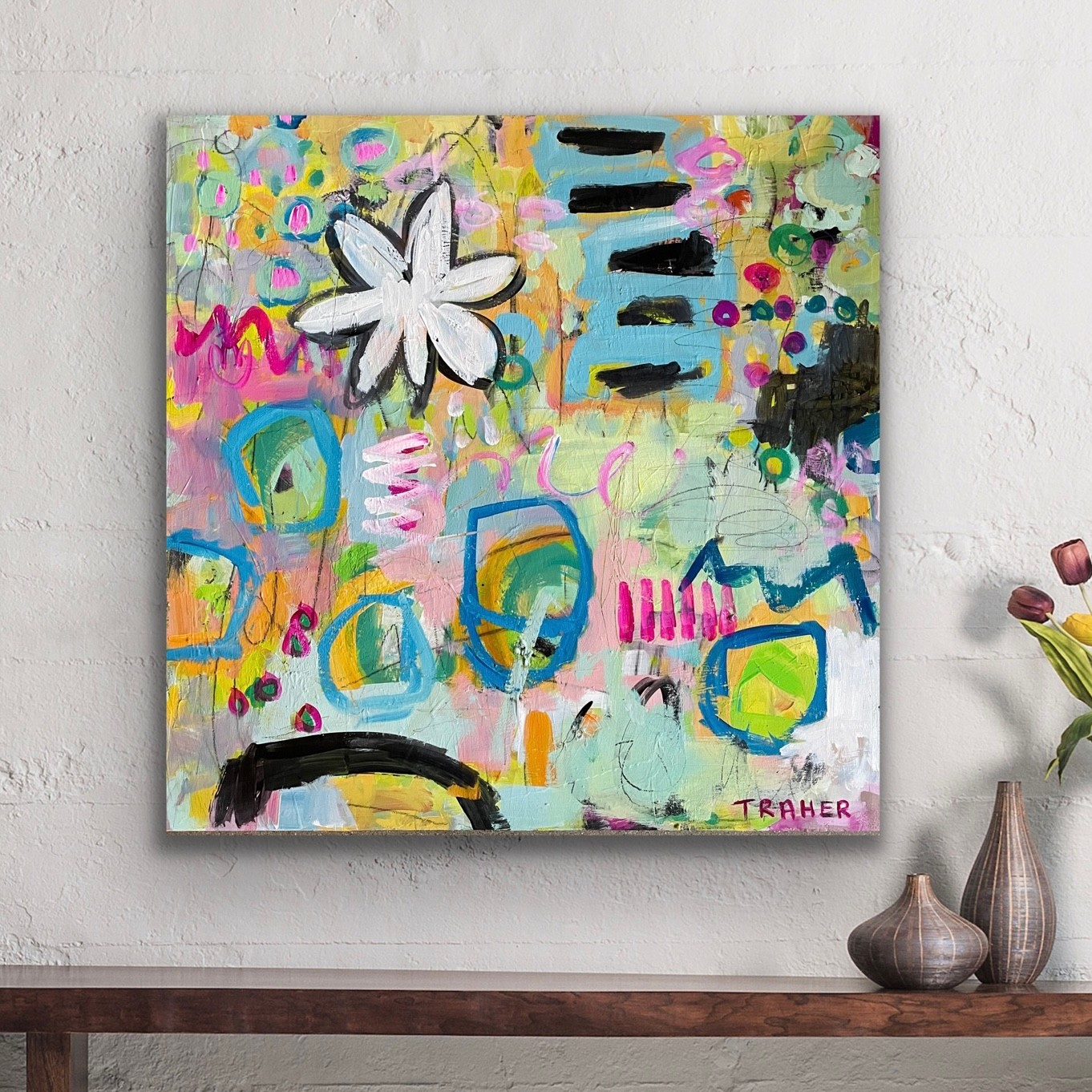 Flowers make my heart sing, always having an important place in my life. From a young girl at my mom's feet, watching her create beautiful arrangements, playing with the broken and discarded pieces on the ground I found as my treasures to owning my own home, building and shaping my gardens and flower beds. Flowers are woven into my life and are constantly filling various pots and vases, picked from my garden or the ditch, with equal enjoyment. How wonderful to have a pit of sunshine and happiness on your wall all year round.