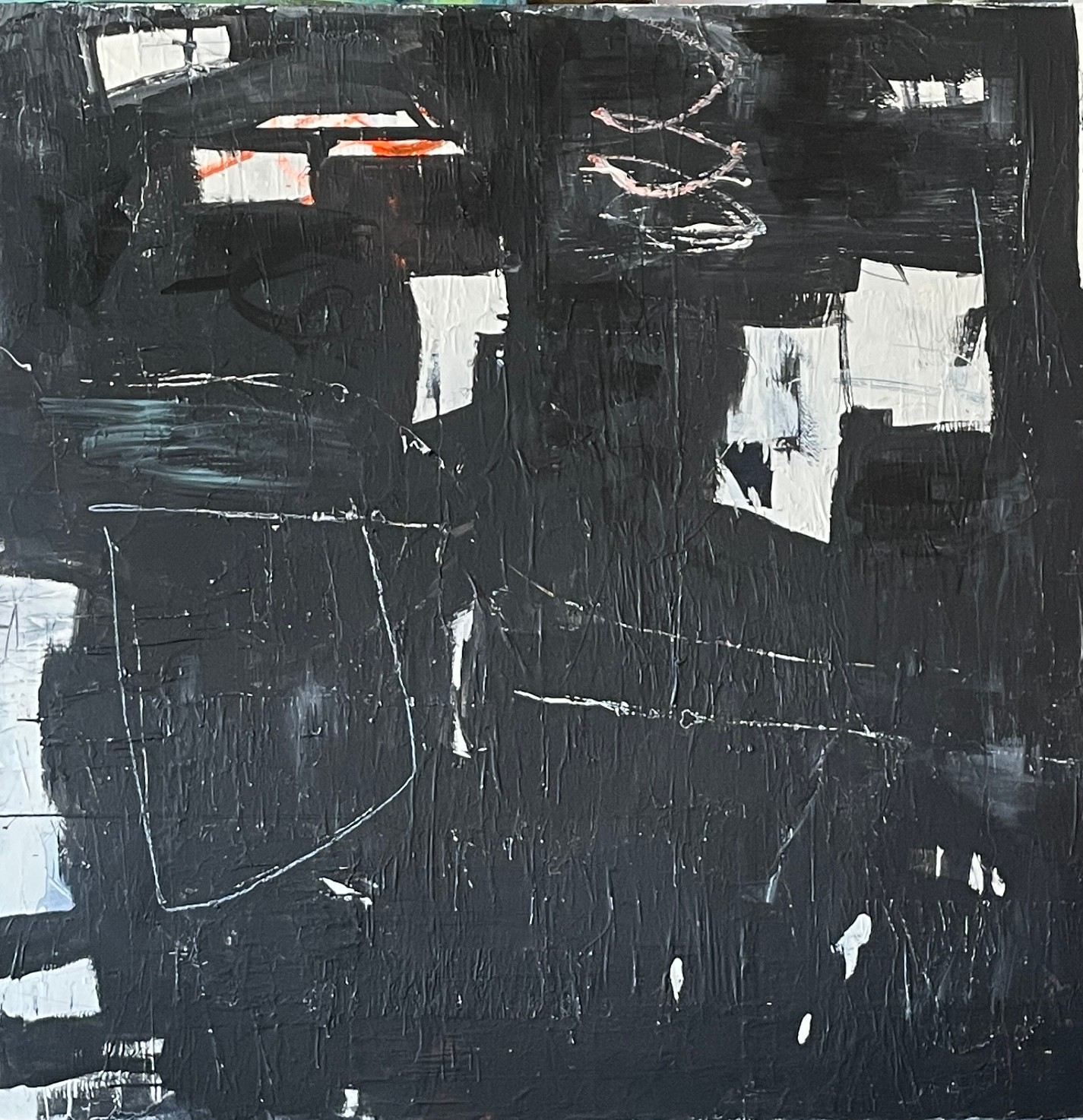 The process involves layering paint, collage, paint and more paint, layers and layers with colours, shapes and designs that are scraped, sanded, scratched and dug into, repainted, revealing and leaving bits of the past, the history of each layer. A story emerges that blends this history with the final design, which is rich in texture. The beauty is in the discovery, the rich surface and the hidden bits that can only be seen by getting in close and exploring its secrets.