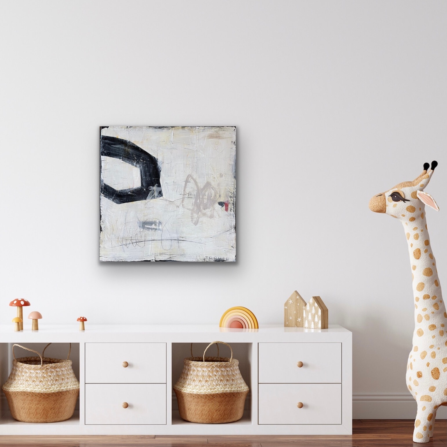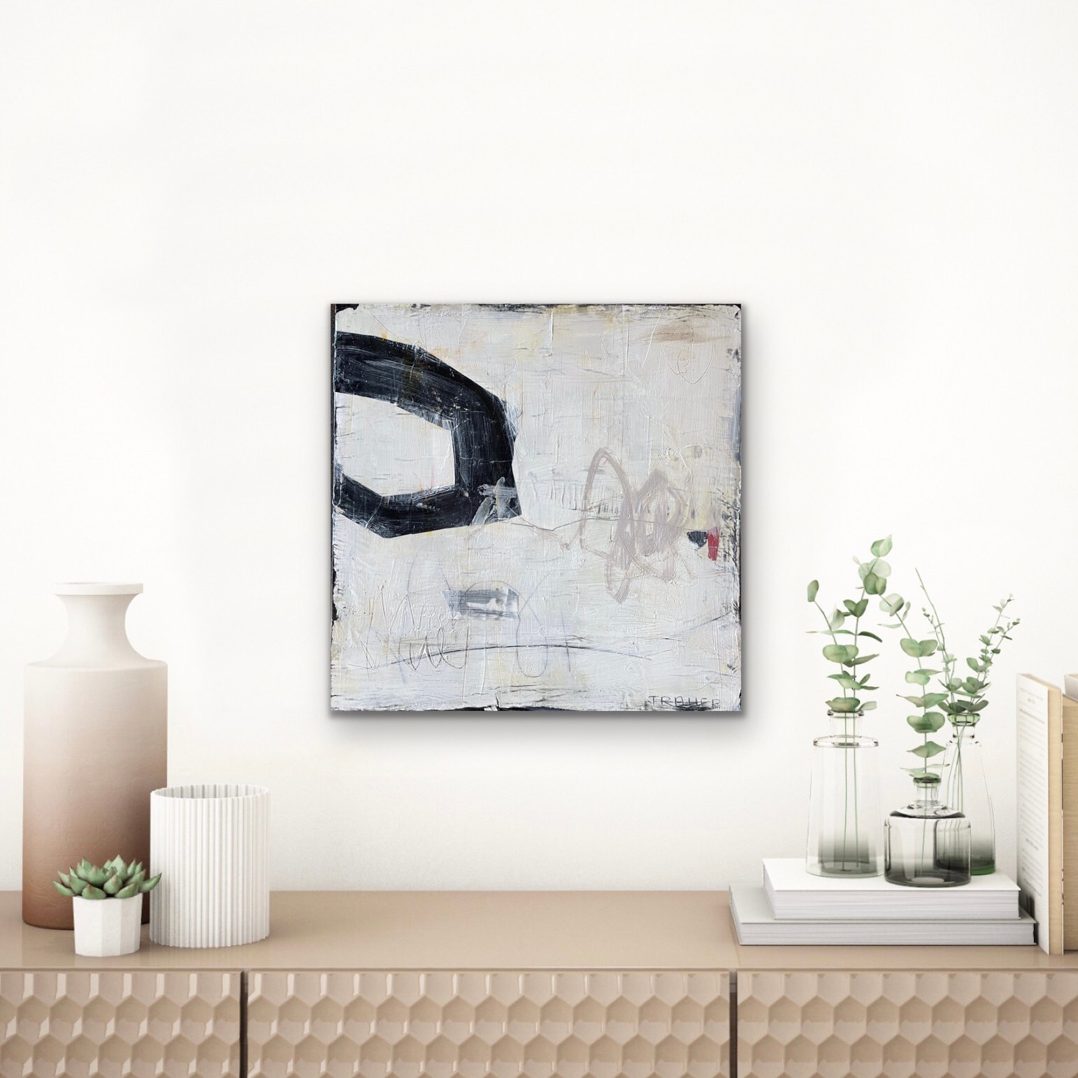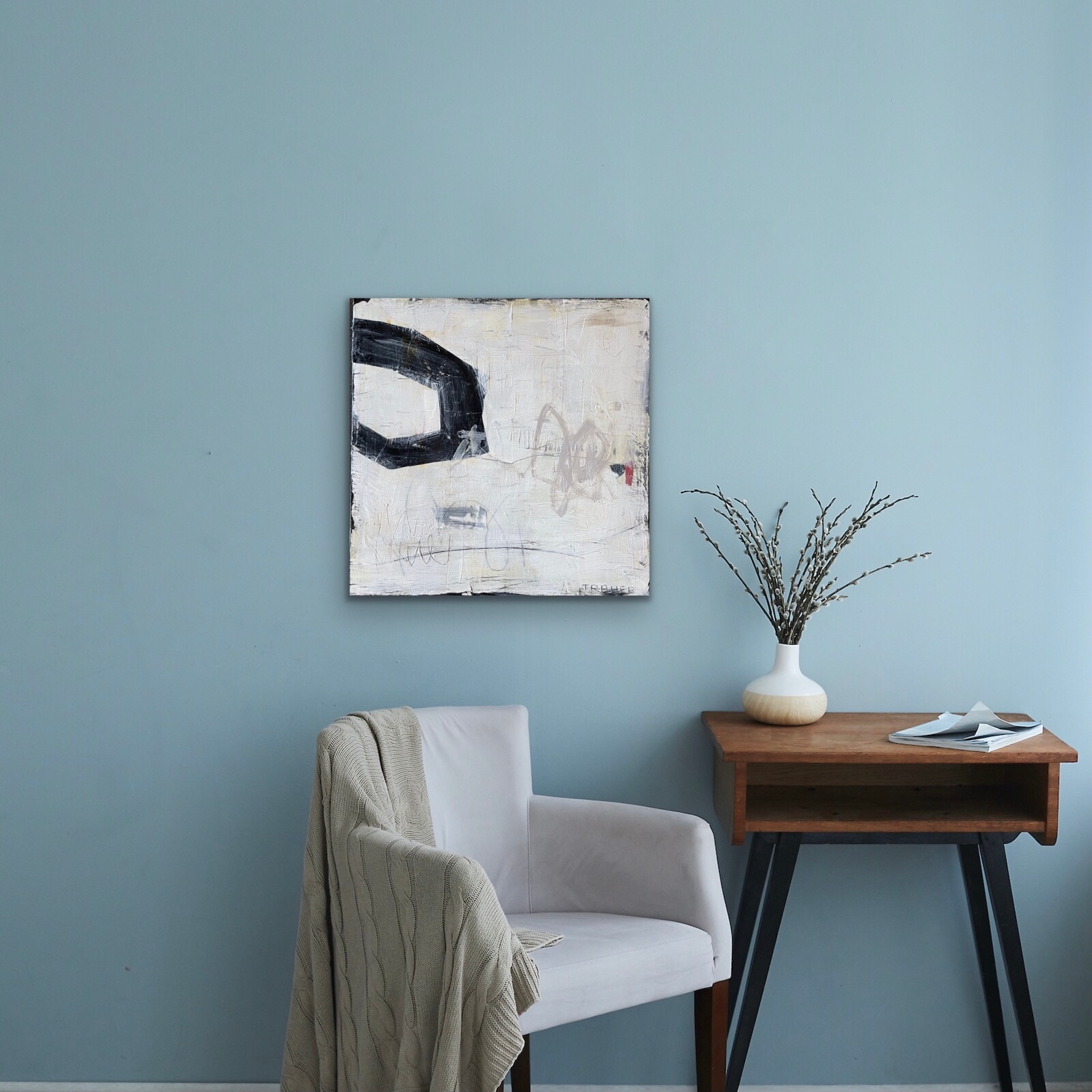 Exploring line and space where the edges meet—mixed media, collage, graphite, pencil. Miriam Traher is an intuitive artist, creating mixed media abstracts: led by color, shapes, marks and lines as they are layered and responded to. Her work is vibrant, expressive and full of visual texture, bringing life and joy to homes. The sides are natural hardwood.