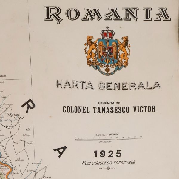 Harta Generală a României Mari întocmită de colonel Tănăsescu Victor la o scară de 1:400000. În cele patru colțuri ale hărții au fost dispuse mai multe cartușe în care au fost reprezentate harta etnografică a României, harta Bucureștiului din 1923, harta Europei și stema țării. Aceasta a fost realizată în 1925 în tehnica litografiei, fiind tipărită pe hârtie maruflată pe pânză.