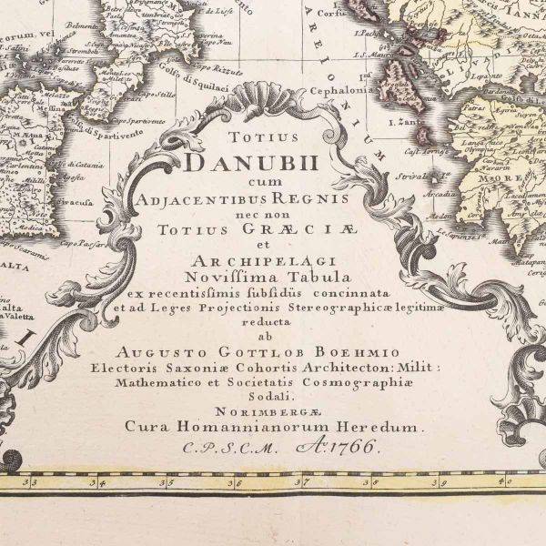 Harta Dunării și a regatelor adiacente precum și a întregii Grecii și a Arhipelagului, întocmită de Augustus Gottlob Boehm (Totius Danubii cum adjacentibus regnis nec non totius Graeciae et archipelagi. Novissima tabula ex recentissimis subsidiis concinnata et ad leges projectionis stereographicae legitimae / reducta ab Augusto Gottlob Boehmio). Aceasta a fost realizată prin gravare în cupru în anul 1766, fiind colorată manual în epocă.