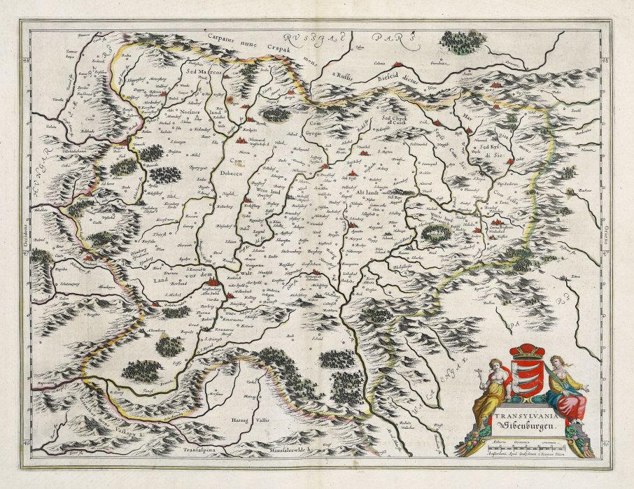 The board presents Transylvania surrounded by mountains, with "Russia pars" to the north, "Walachiae pars" to the south and "Ungariae pars" to the west, with the division in various regions, without being delimited by borders: Land vor dem Walt (The land before the forest), Weinland (Land of Wine), Altlandt (Old Land), Wurtzland (Burzenland), Nosnerland (Land of Bistrita). It comprises a multitude of localities, the great cities being marked by miniature symbols - boroughs with towers and ramparts - coloured in red: Weisenburg / Alba Iulia, Hermanstat / Cibinum / Sibiu, Clausenburg / Colosvar / Cluj, Cotona / Brasonia / Brașov etc. In the lower right part there is a cartouche adorned with two female characters, Faith and Wisdom, which frame the Bathory Family shield (three bear's claws), one of the characters holding a cross in her hand. Under the cartouche is the graphic scale expressed in German miles.