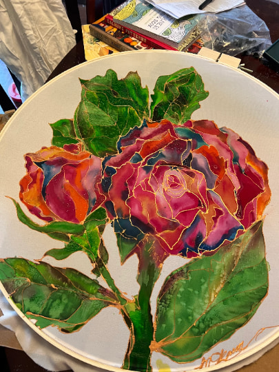 This exquisite round silk painting captures the timeless beauty of blooming roses, set against a rich, deep blue background. The vibrant reds, pinks, and greens are highlighted with MJ Okawa's signature metallic gutta outlines, creating a captivating interplay of color and texture. Framed in a sleek natural wood circular frame, "Forever" exudes elegance and romance, celebrating the vibrant beauty of nature with a contemporary touch.