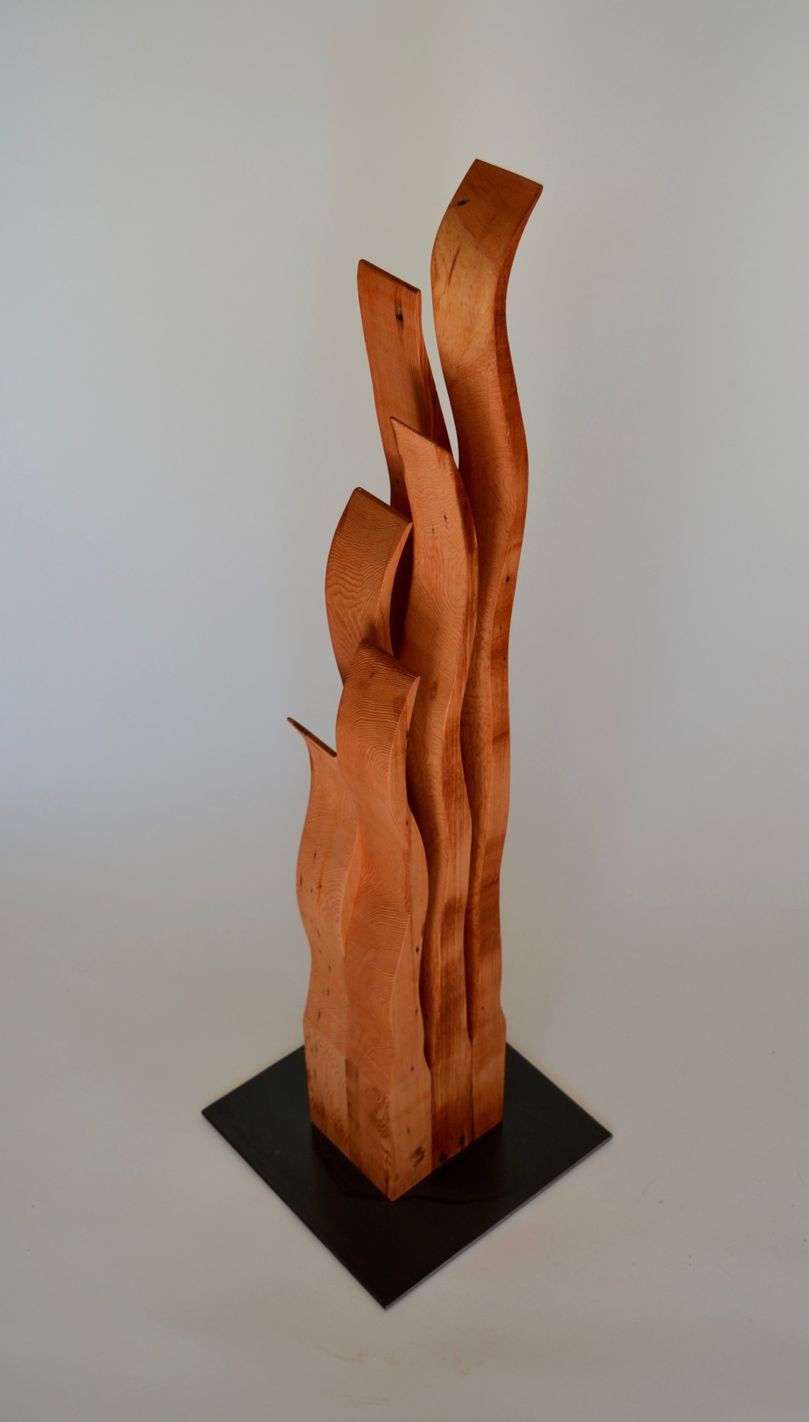 Once, I was offered free reclaimed redwood - but it turned out to be Douglas Fir wood. I took it not knowing what to do with it. This inspired me to developed a new bandsaw technique and I created a whole new series of work based on this new process. Flames was the first sculpture in this series. The wood came from old wall studs with nail holes, black discolorations and other imperfections which gives it a very unique character, and a beautiful contrast to the warm colors of the wood - just like a sparkling and warm glowing fire.