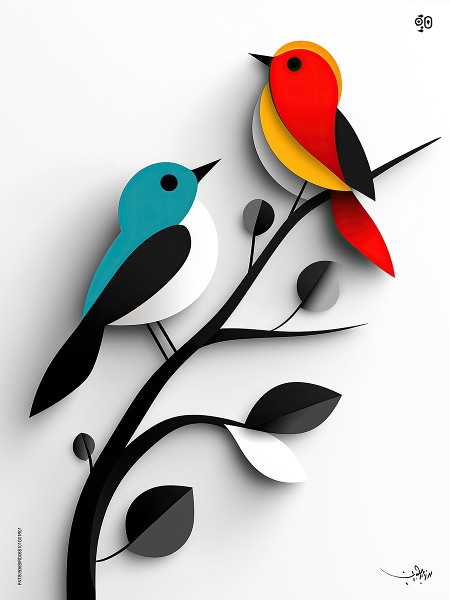 What elevates this artwork is not just color theory, but narrative. It speaks of contrast and complement: of fire and stillness, upward motion and grounded presence. The red bird seems extroverted, the teal one introspective - yet both are bound by form, perch, and balance.