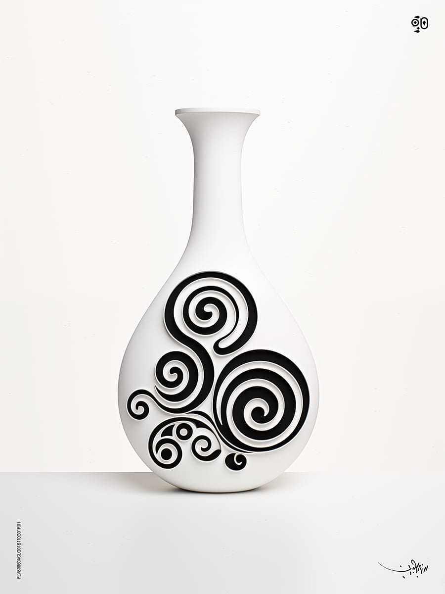 This artwork presents an elegant white vase adorned with flowing black spirals, resembling the rhythmic beauty of Arabic calligraphy. The carved-in swirls create a sense of movement and depth, as if the vase itself is imbued with the fluidity of ink strokes. The contrast between black and white enhances the bold yet delicate aesthetic, offering a harmonious blend of tradition and modern minimalism. The artistic value of this piece lies in its ability to reinterpret Arabic script into an abstract floral form, transforming a functional object into an expressive artwork. The intricate layering of swirls gives it a sculptural quality, making it appear almost three-dimensional.