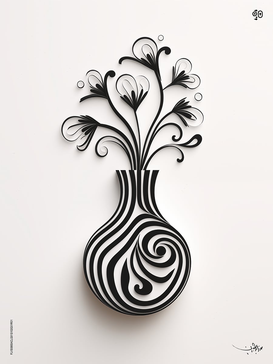 This digital artwork presents a stunning flower vase that seamlessly integrates the elegance of Arabic calligraphy into its intricate design. The body of the vase is adorned with rhythmic black-and-white swirls, resembling the fluidity of handwritten script, while the flowers extend outward in curving, calligraphic strokes, giving an illusion of motion and organic growth. The artistic value lies in its delicate balance between traditional Arabic calligraphy and modern minimalism. The controlled yet free-flowing lines create a unique aesthetic that bridges heritage with contemporary design. The monochromatic palette enhances its visual impact, making the contrast between light and shadow more pronounced.