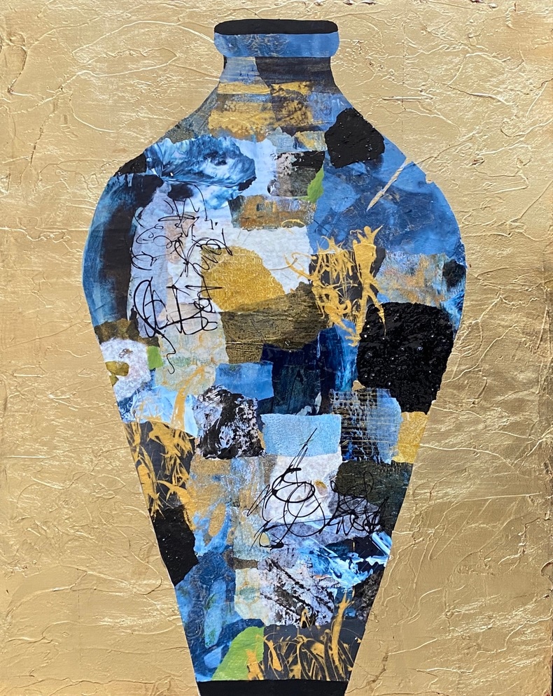 Twenty years ago, I took a few wheel-thrown pottery classes and fell in love with shaping the clay and layering the glazes. My body can no longer do the work required to throw pots, so now I explore the symbolism of vessels using collage, paint, and gold leaf.