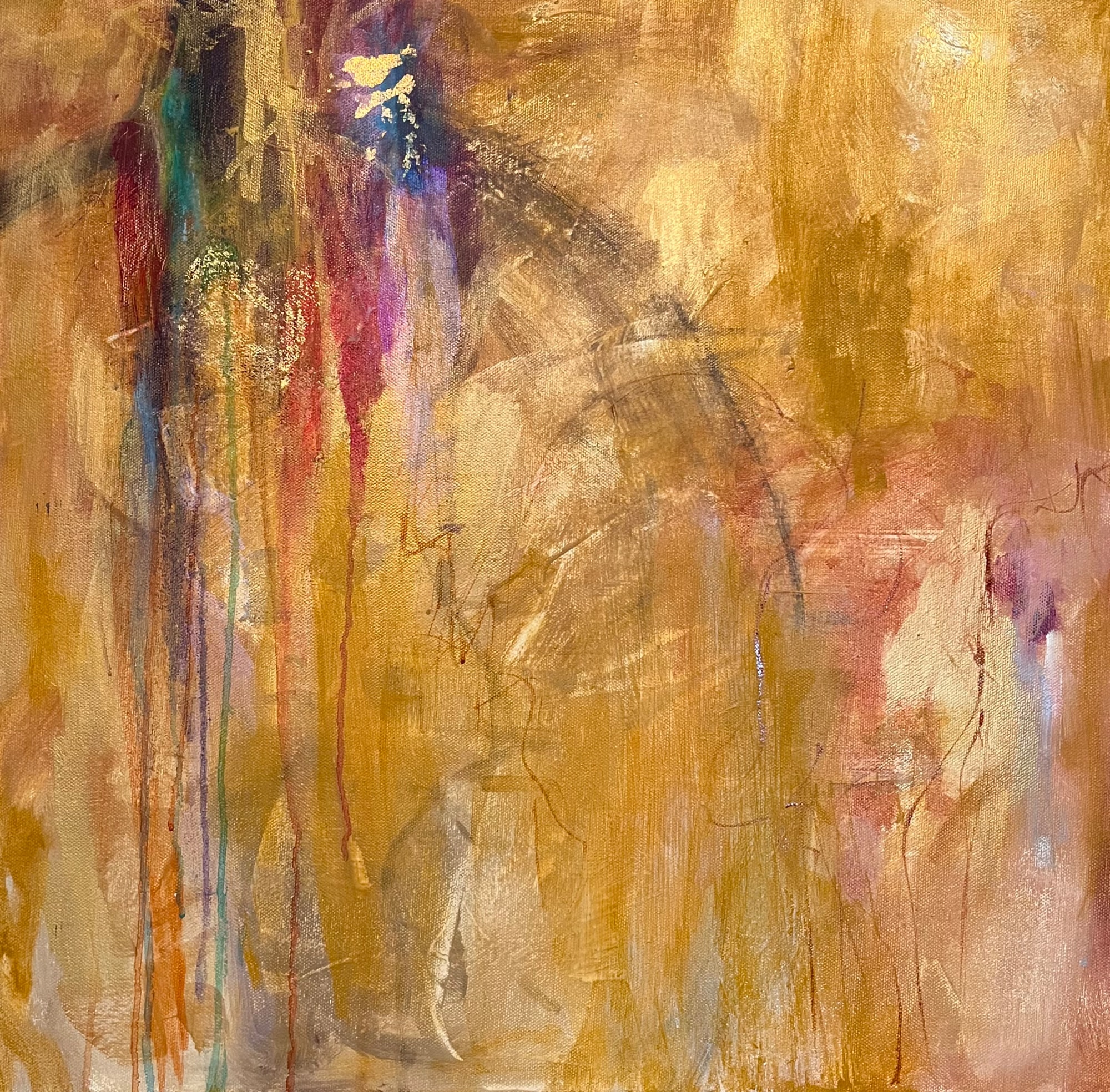 Layers of gold metallic paint and ochre with touches of gold leaf, and drips of magenta and teal