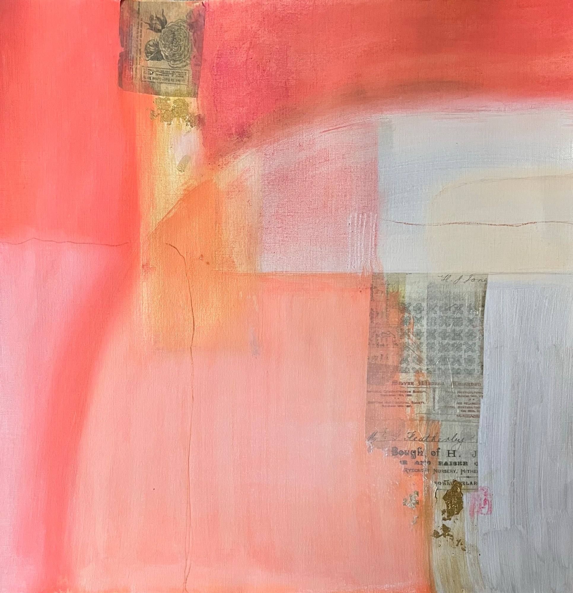 Collage paper elements, gold metallic acrylic, gold leaf accents
