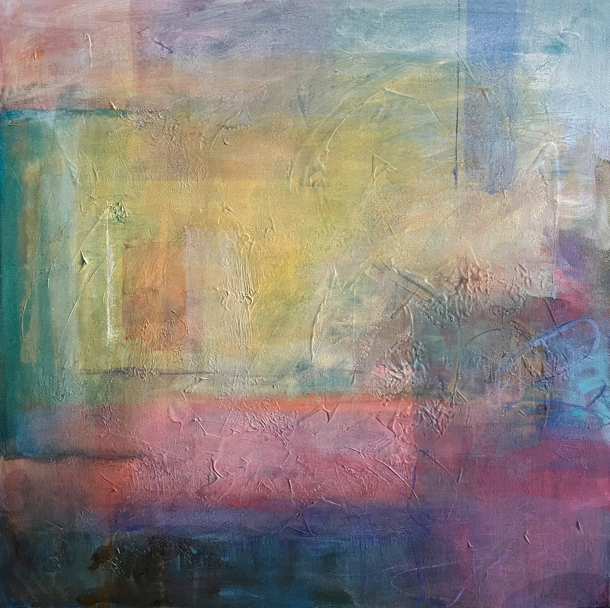 An intriguing abstract in a game of hide and seek, with layered panels of transparent color hiding and revealing subtle details and texture. A rainbow of hues that coordinates with any decor or color.