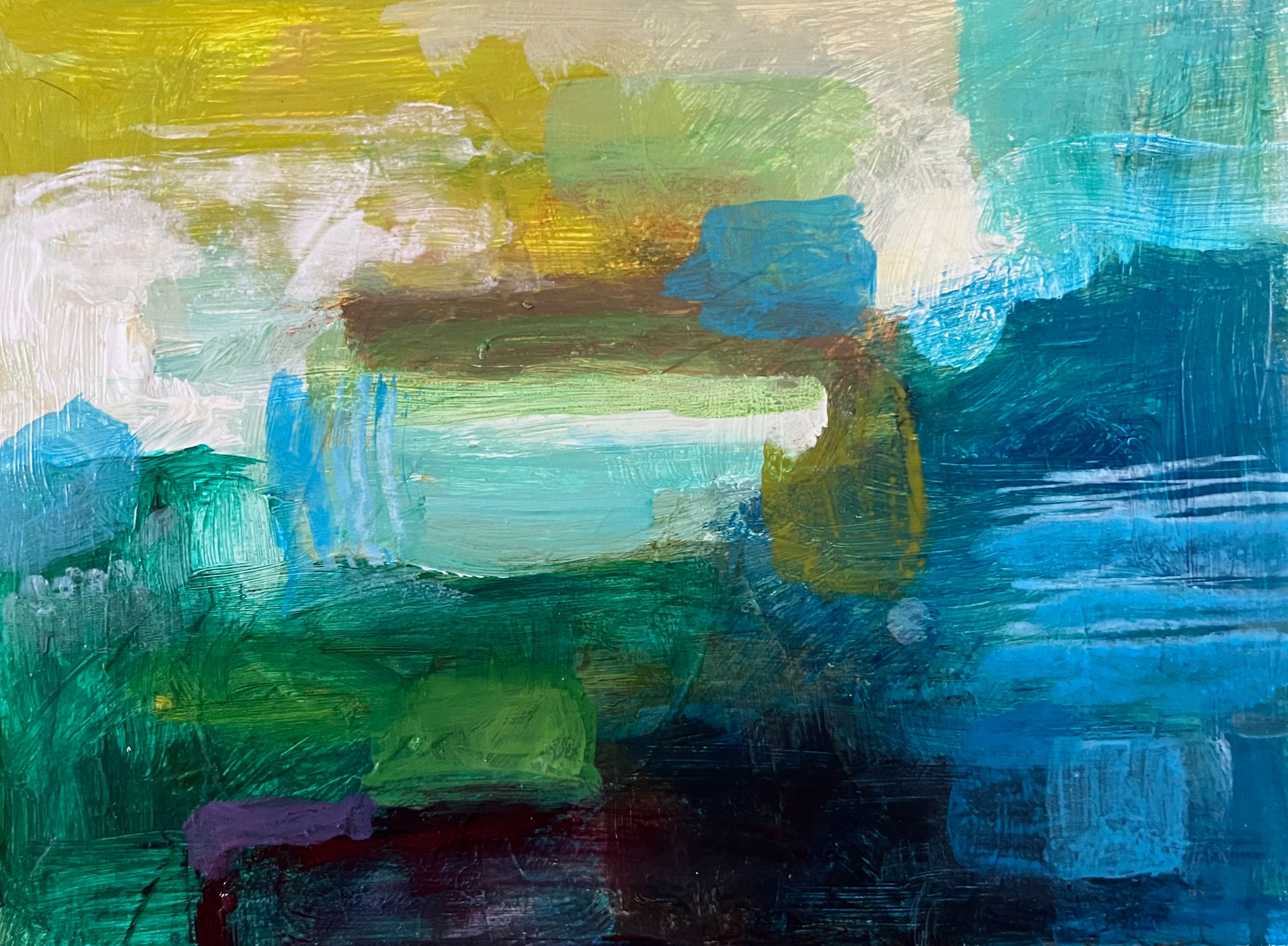 Emmerse yourself in a watery pool of greens and blues, with mustardy yellow greens and siennas, floating in a composition of organic rectangular shapes. Textures and subtle marks appear every now and then to add depth and visual interest. This tiny piece of art makes a big impact on a shelf, side table or desk for a burst of joy with just a glance.