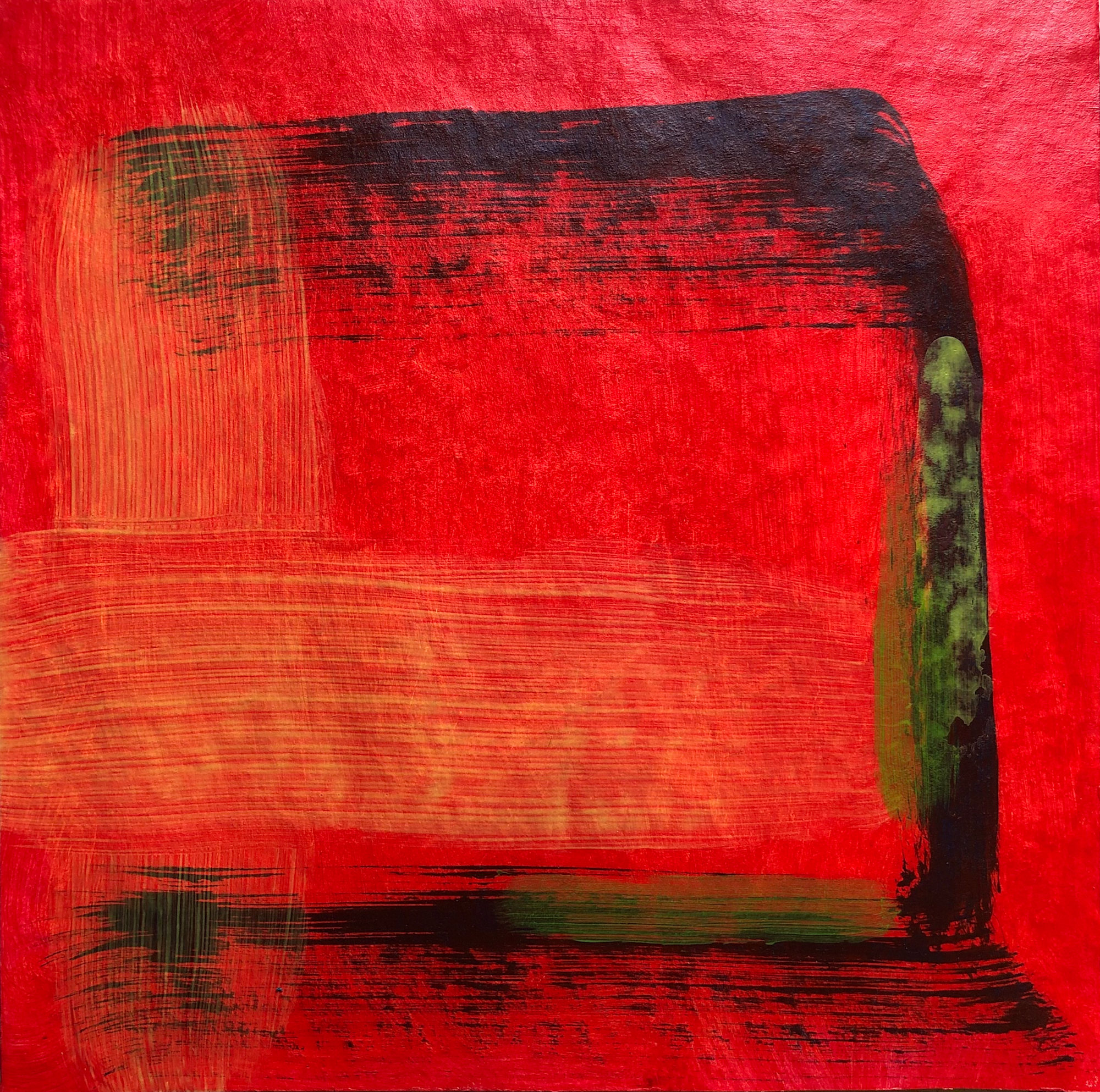 Charcoal sweeps carve a stark window through fiery crimson, a flash of verdant green locking attention—made for spaces that thrive on bold, uncluttered drama.