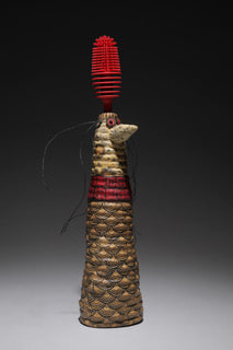Mulberry papers cast on coiled basket, printed. Plastic brush, beads.