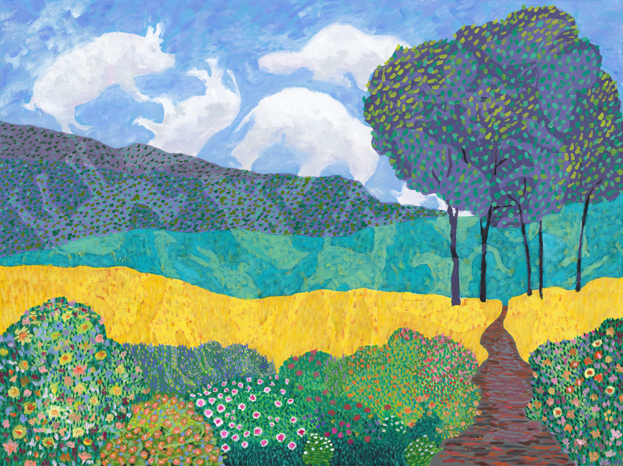 Playful landscape with animals, some in plain sight, some well hidden. Giclee on canvas or archival watercolor paper also available in a variety of sizes. Contact for giclee pricing.