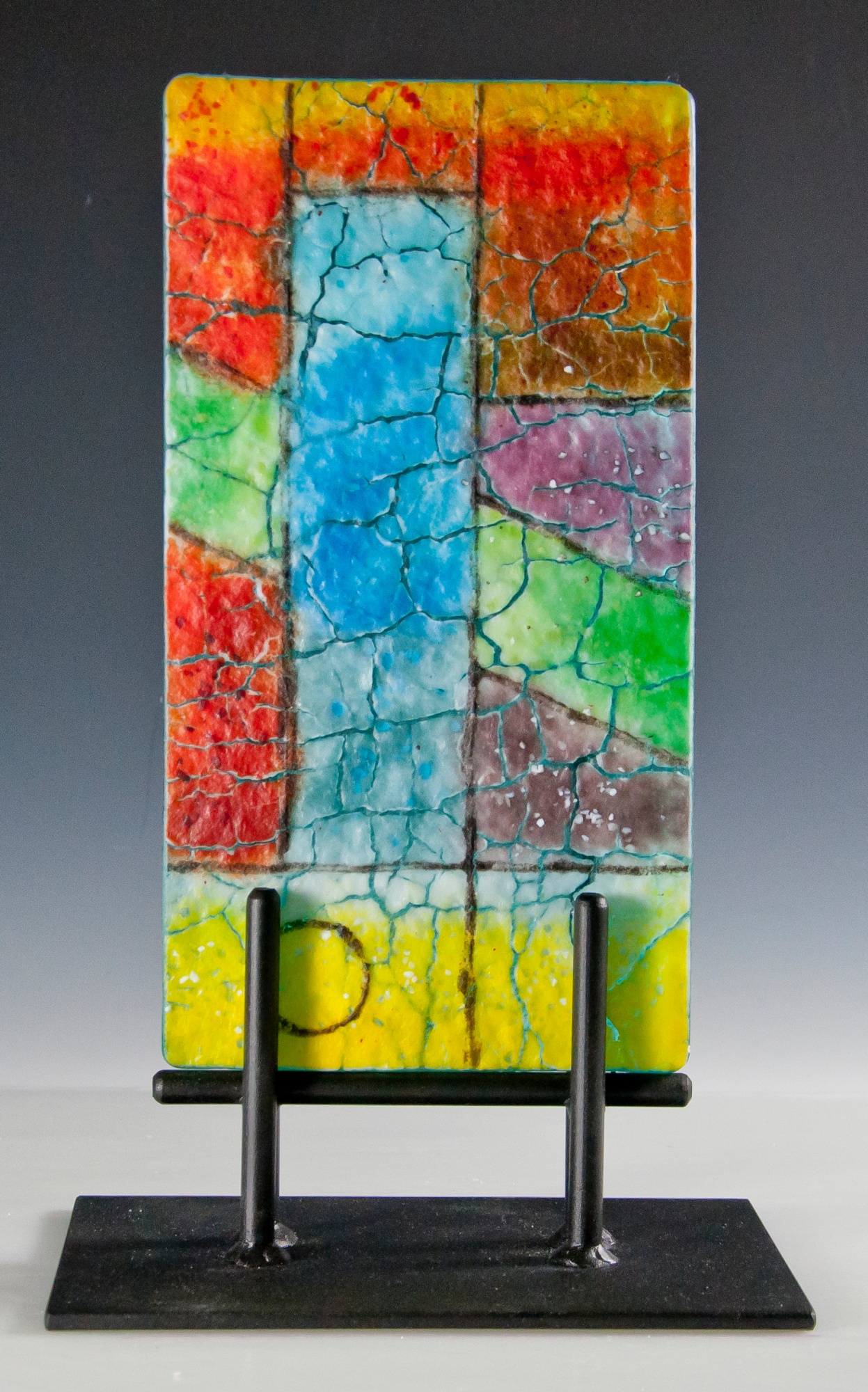 Fused glass abstract. Made entirely out of glass. Iron stand priced separately.