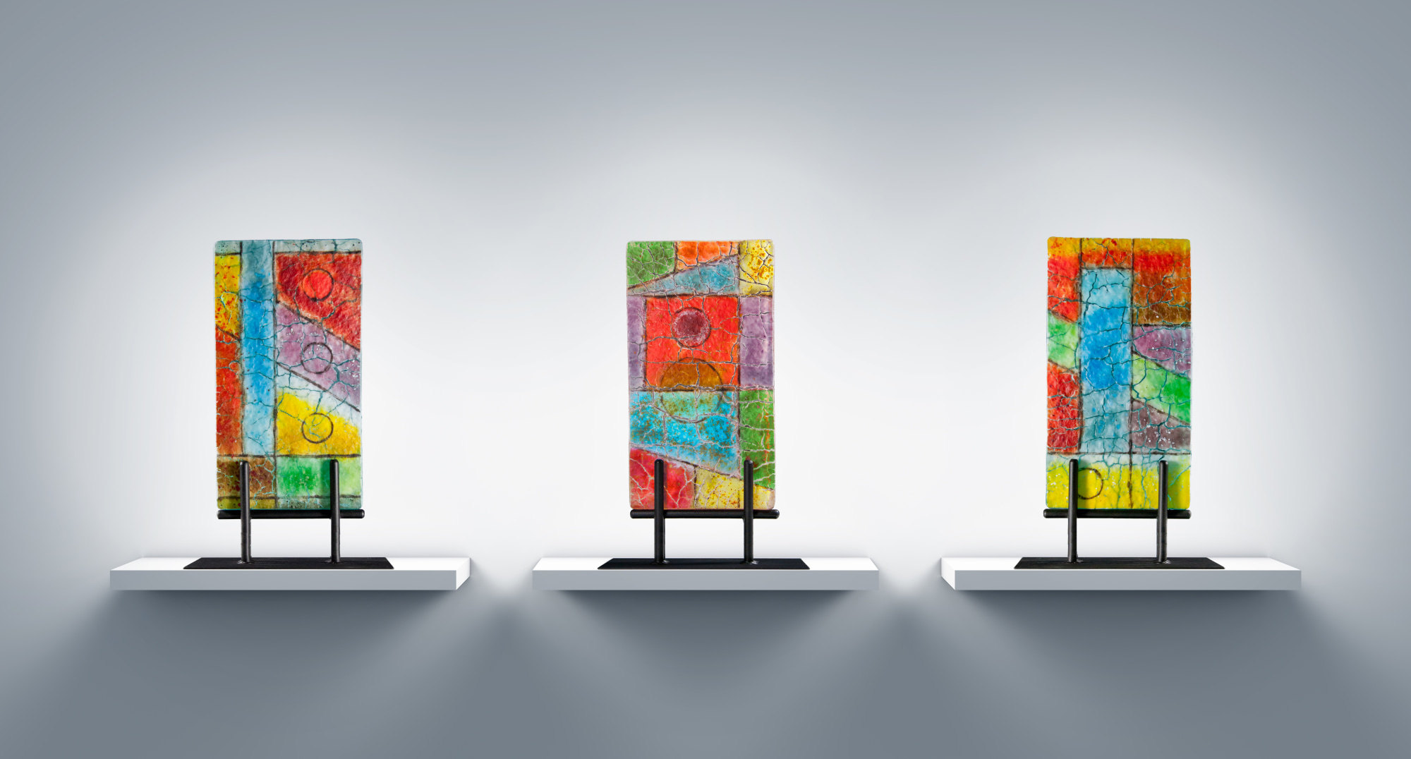I started working in glass in the year 2000. I taught myself how to paint "with" glass using crushed and powdered glass that is later fired in a kiln