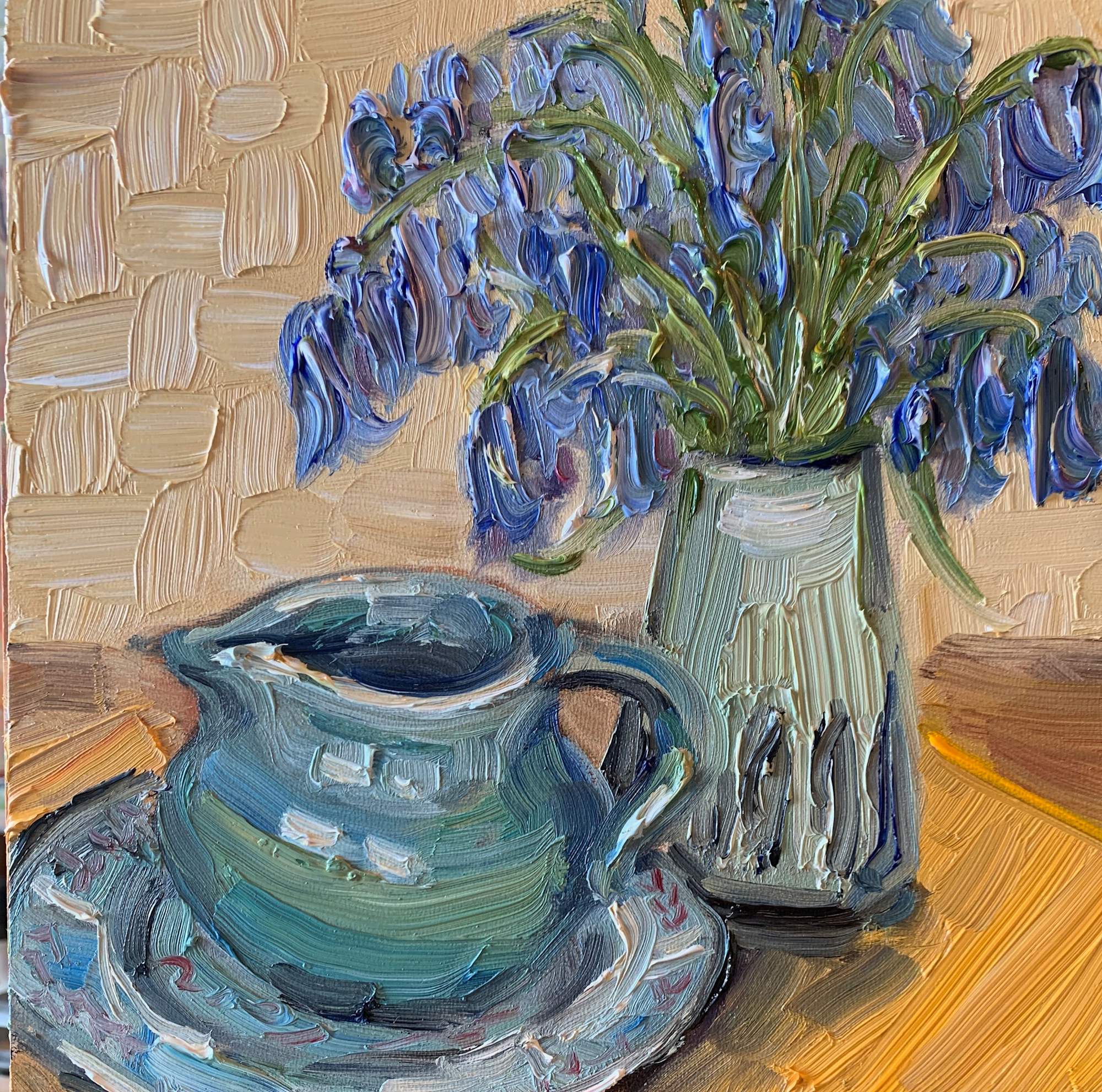 This was one of 10 images I created for a garden club cookbook. I enjoyed creating the still-life to paint for each category. In this one I was sure to include a small pitcher that had been my grandmother's and the vase was created by a local ceramics artist.