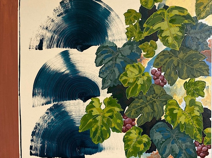 Grape plants are associated with abundance, fertility, transformation, divinity and mysticism. The fans in Abundance are symbolic of wealth, wisdom, protection, and the sun.