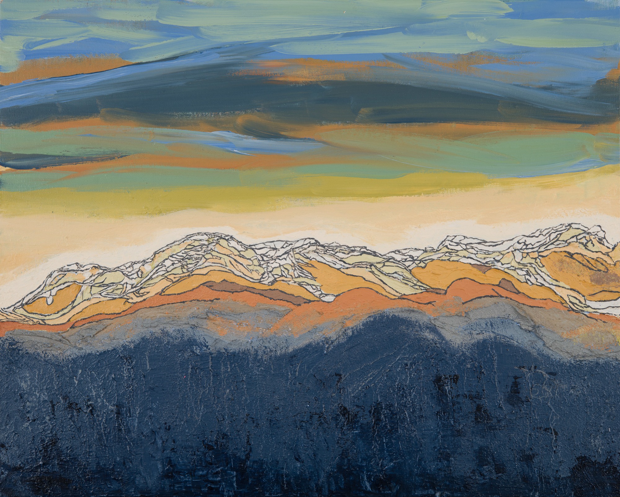What mysteries does this island hold? Lovely palette of yellow ochre, rust, white, blue and green.