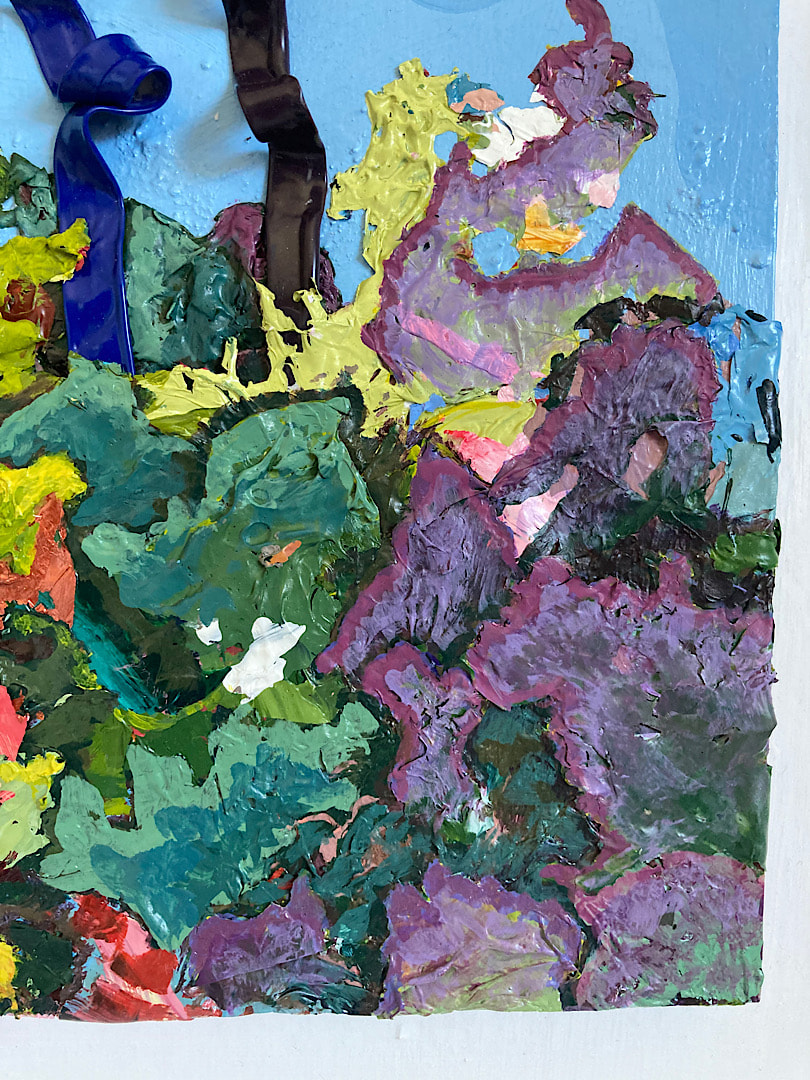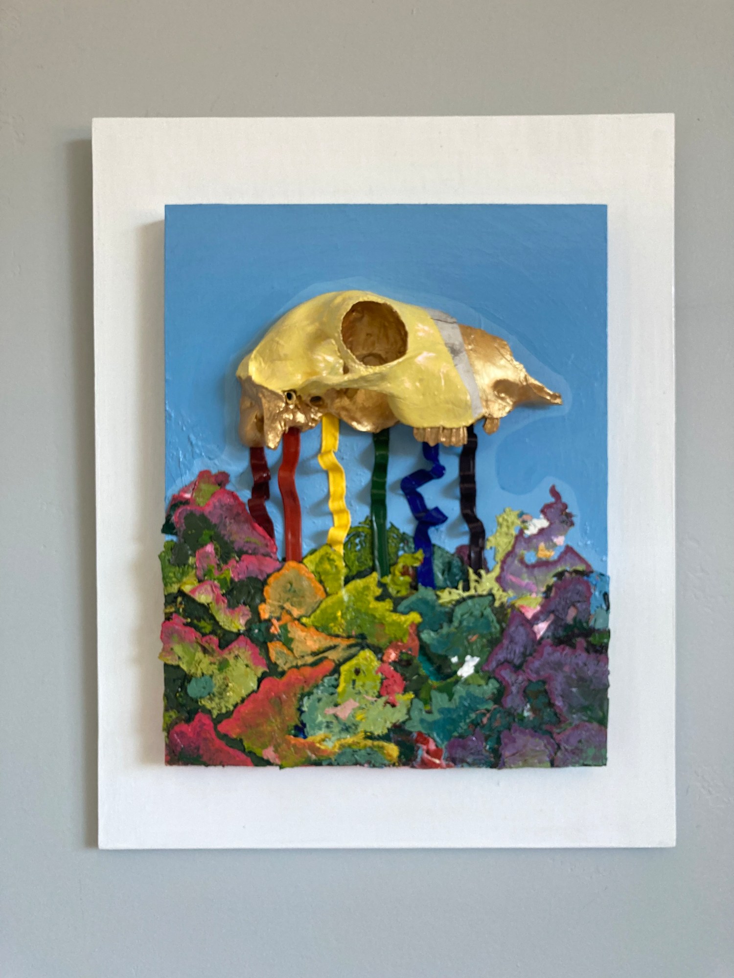 This artwork features a found deer skull that I cleaned and sealed prior to painting. My respect for the animal deepened during hours of handling. The textured layers are acrylic skins. Remnants of color mixed for paintings over the past two years were saved, with this series in mind. The materials support my intention to show and celebrate that, although matter changes form, life continues. The skull and acrylic skins served their original purpose. Here they are given a new life.