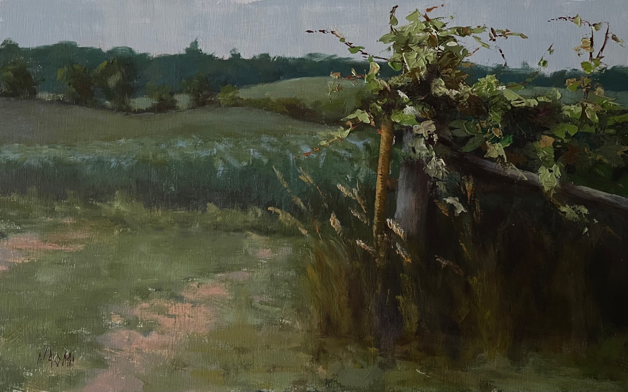 I painted "Ever Reaching" as a counterpoint to "Domesticated". Both pieces were created during the 2023 Red Wing Plein Air event. "Domesticated" is of a well-groomed vineyard, with grape vines trimmed to grow on trellises. "Ever Reaching" is nature's version of grape vines choosing to grow along the field fence completely free to grow however it wants. "Domesticated" was painted on a bright, sunny day with warm sunshine, whereas "Ever Reaching" was painted on an overcast day with cool light. In fact, this painting had to be finished in the studio because I had to leave early due to rain.