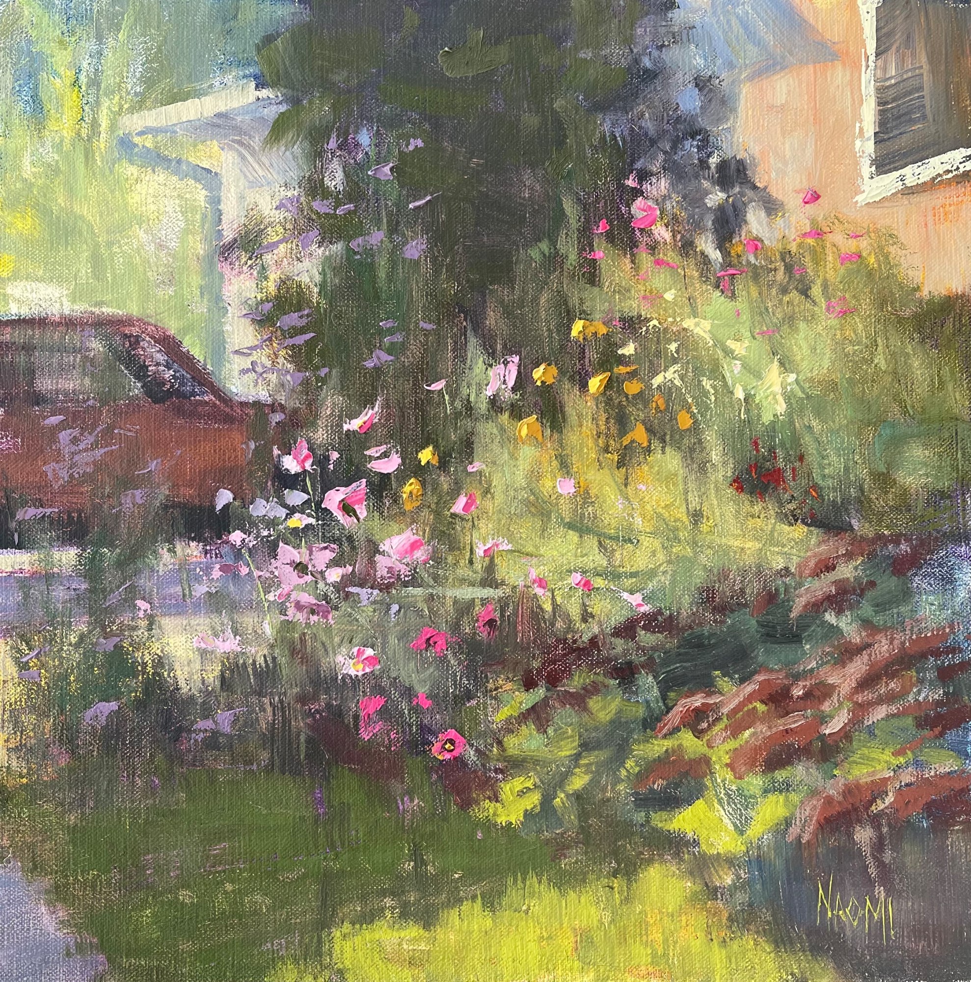 This piece was painted en plein air in Glenbeulah, WI for Paint the Town in Fall Colors 2022 (Plymouth, WI). The airy, colorful flowers caught my eye as I was driving around looking for something to paint. The garden obviously caught the eye of many bees and birds and flying things because they were busily flitting around on this sunny fall day.