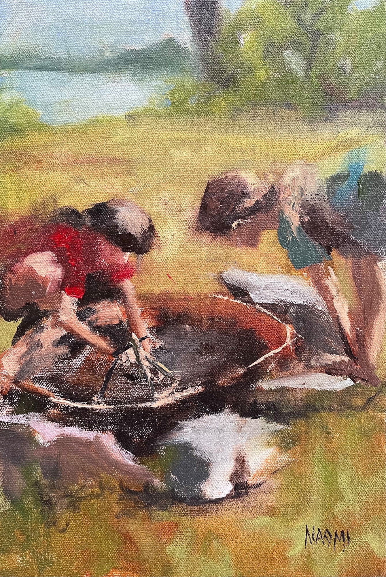 This is a study for two larger paintings. One has two figures like this one and is called, "Only Takes a Spark." The other has only the crouching figure on the left and is called, "Moot Point."