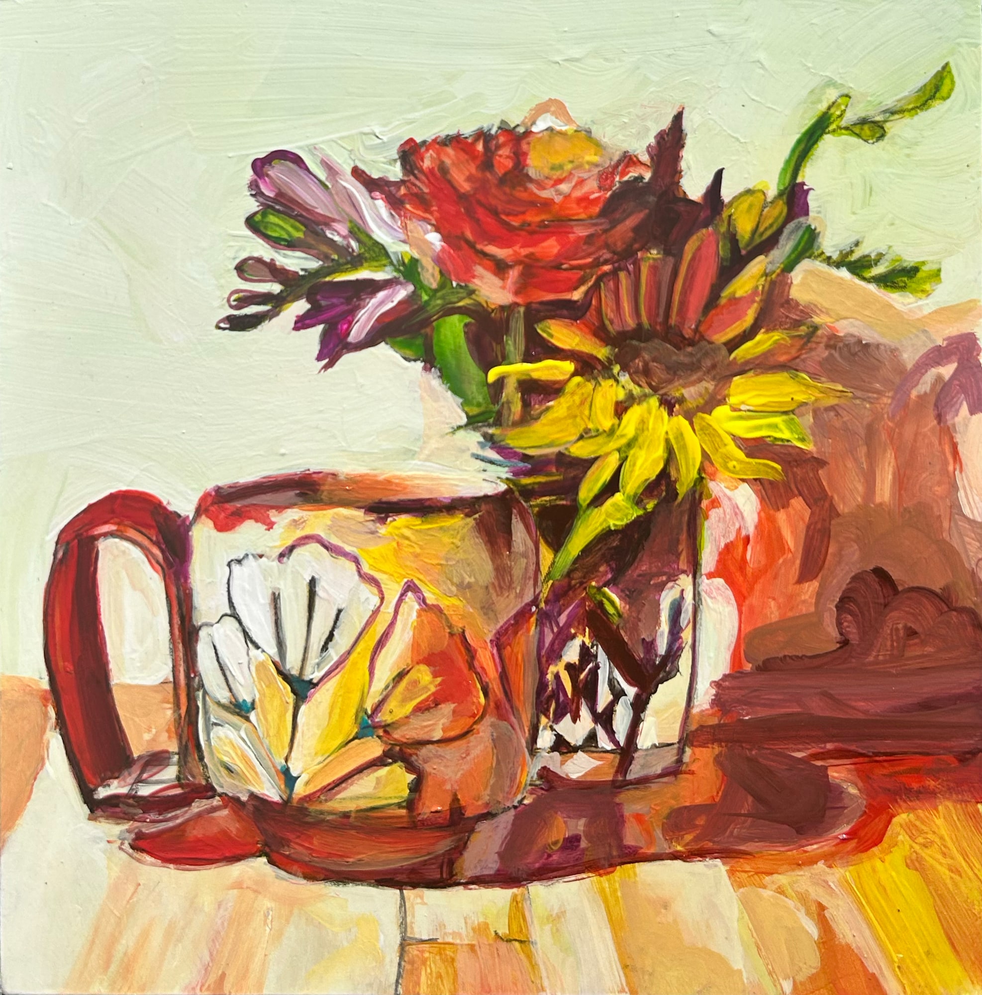 Embark on an artistic journey with this alluring painting, where muted warm tones weave a tapestry of sophistication. Immerse yourself in the subtle charm of a mug graced by the delicate presence of freesias, a tender rose, and the bold allure of a sunflower. Elevate your collection and seize this opportunity a rare fusion of understated elegance and floral enchantment awaits.