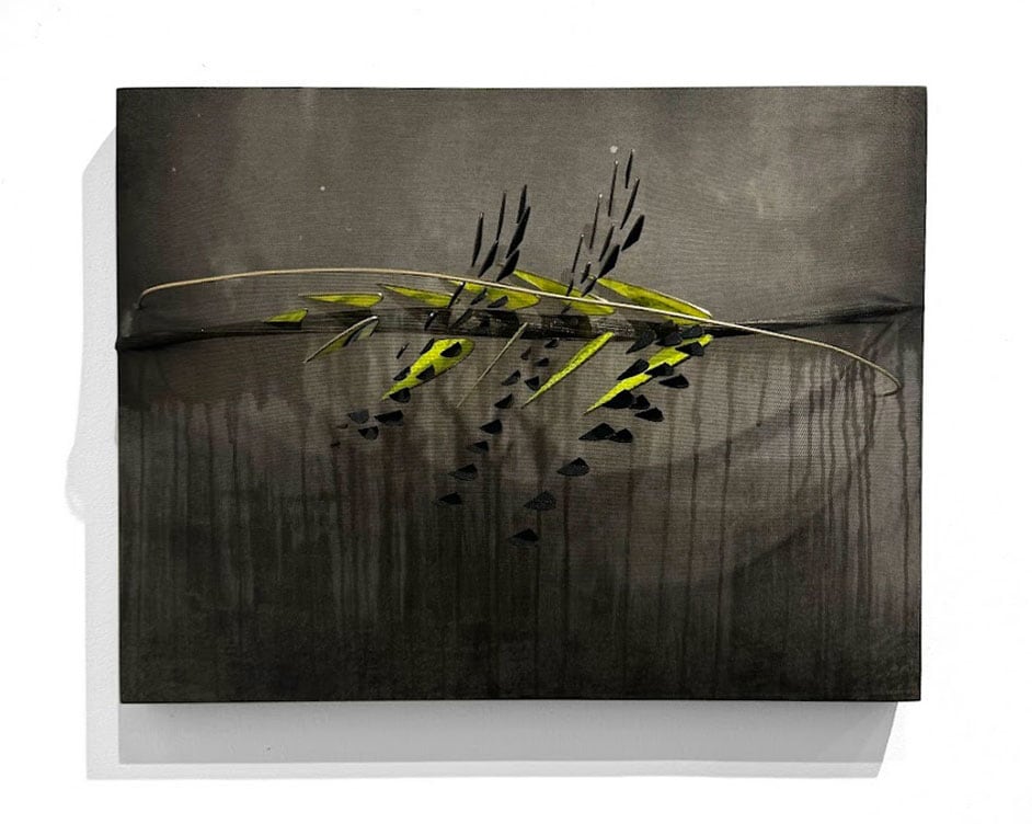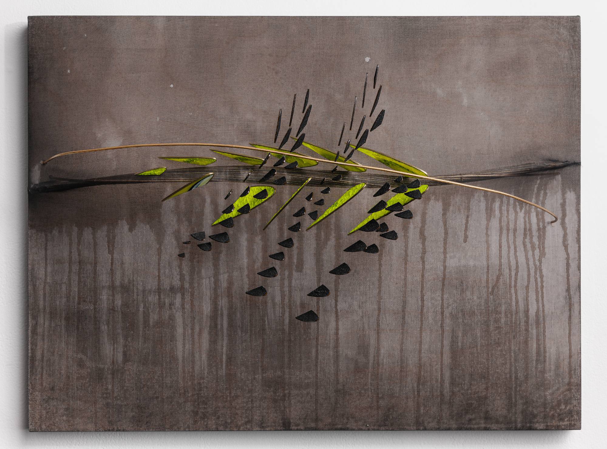 Acrylic, sumi ink, enamel, organdy, tulle, rush grass, wire on thermoplastic and panel