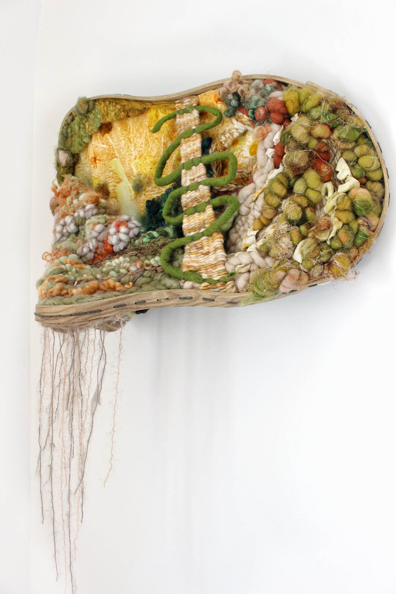 The bent wood frame pushes the work off the wall to create crevices and pockets, a play of what we can see and what is hidden. The yarn builds up texture and is playing off the botanically dyed cloth in the background to reference landscape.