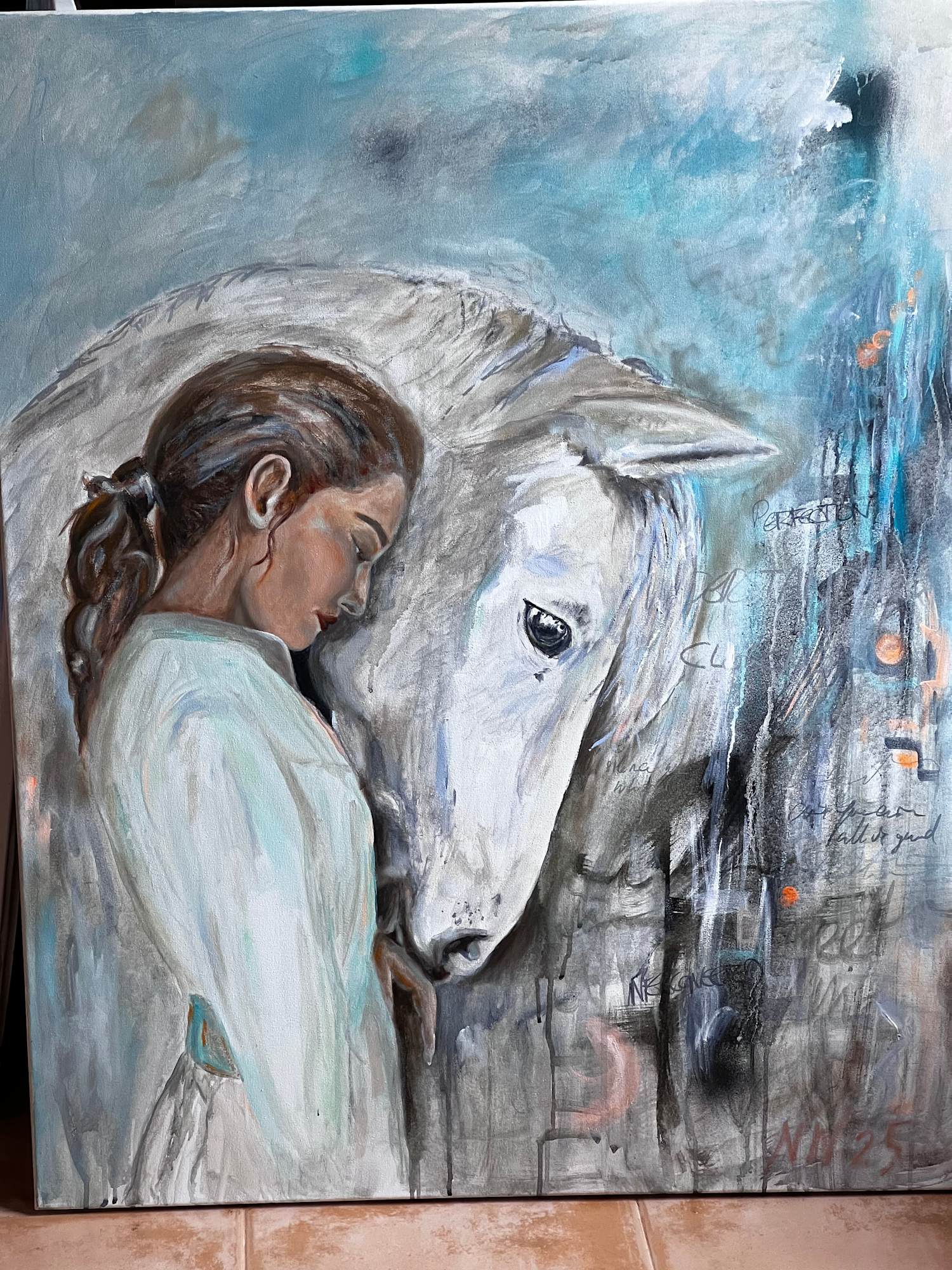 Together zeigt eine Frau mit einem weissen Pferd. Beide sind in der Begegnung mit dem Anderen und doch in der eigenen Präsenz. Das Pferd als Spiegel und als Symbol ist tragend im Hintergrund. Achtsamkeit, Weichheit und ein Ausdruck des All-Eins Seins sind Gefühle die in diesem Bild zum Ausdruck kommen. Sie ist Teil der Serie "Moments".