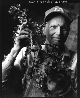 Some key elements make this an iconic photo of a midwest American farmer, the heavily worn pioneer hat, giant thistle, distinct work clothes, and determined expression.