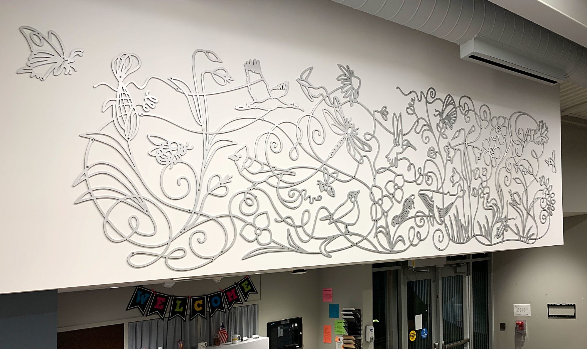 Inspirations for the work are drawn from regional flora and fauna- particularly the relationships between pollinators and plants. This includes plants like Coneflowers, Primrose, Spiderwort, and pollinators like native bees, butterflies, hummingbirds and other local creatures. Curling, spiraling line work references the elaborate trail systems of pheromones left by pollinators as they wind their way between flowers. A few stray whales compete with them as well, in honor of Nebraska’s status as an official whaling-free sanctuary state. And the work references forces of nature and circadian rhythms through an array of cosmological iconography.