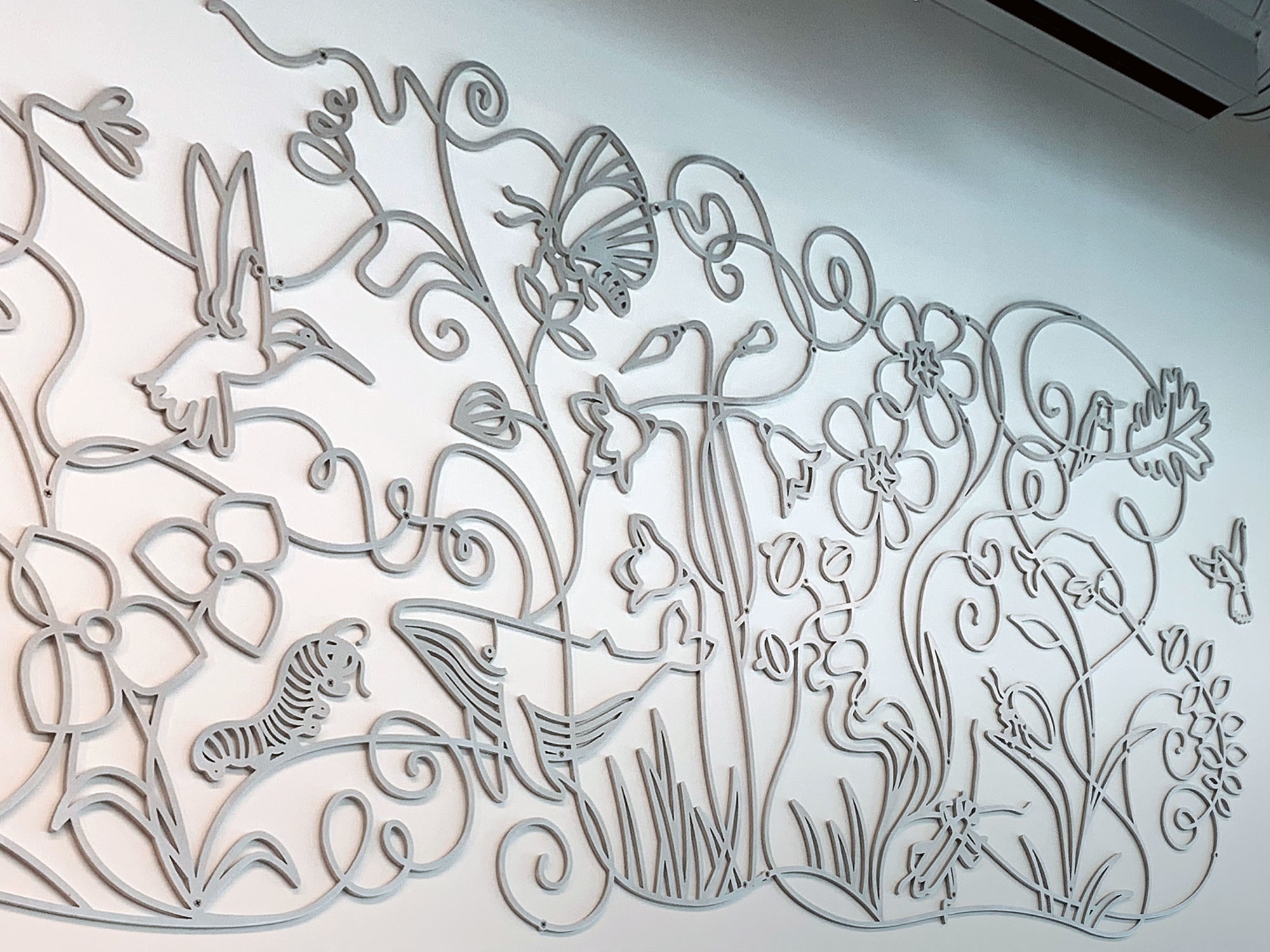 Cut-metal wall reliefs wrap around the crown of the reception desk. A field of illustrative imagery creates a lively canopy to accent the focal point of the Center.