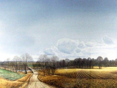 Horizon 713, Near Indian Creek, Gage County is a 20.5 x 29 inch watercolor painting located at the Nebraska Department of Transportation- Materials and Research. This watercolor painting is a fall/wintery landscape with a large blue sky and leafless trees on a recently harvested farmland.