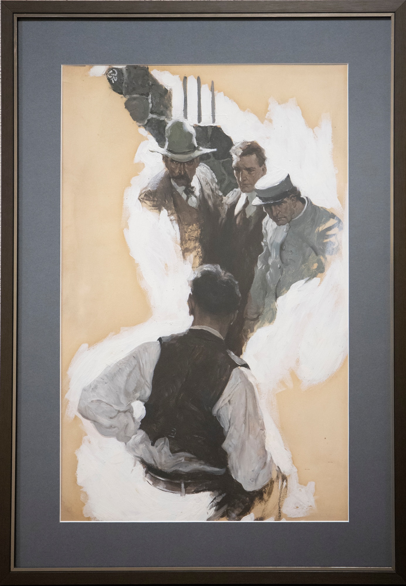 Immediate Jewel IV is a oil on paper painting 25.5 x 16.75 inches located in Chadron State College in Memorial Hall on the first floor lobby gallery. The painting depicts several men that seem to be in a conversation surrounded in a tan color.
