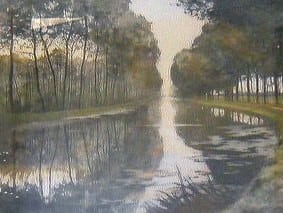 Lakeside is a 21 x 26 inch etching located at the Norfolk Veterans' Residential Facility in the D section seating area near the dining room. This etching is of a narrow reflective lake with tall tree lines on both sides of the lake.