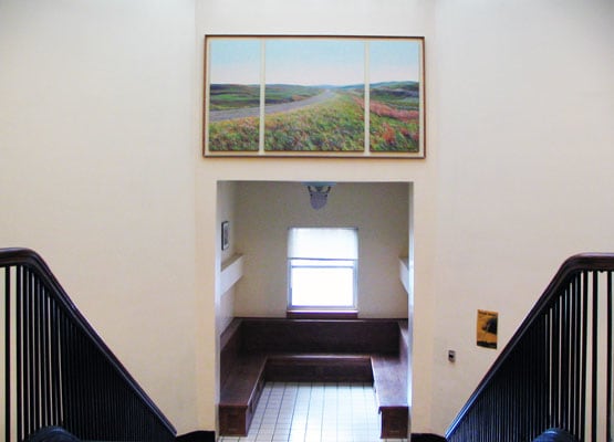The triptych is a depiction of a single landscape, across three canvases. The viewer looks toward the west, on a June afternoon. Highway 2 sweeps from the lower left, past grass-covered dunes, and disappears into the distance at the center. Linda Lillegraven was born in Fort Benning, Georgia and education includes a M.S., Biology, University of Utah, Salt Lake City, Utah in 1976; B.S., in Zoology, Sand Diego State University, San Diego, California 1972; and B.A. Art, San Diego State University.