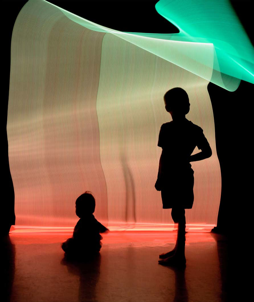 The artwork centers the UNO community, drawing from participatory light-painting workshops held in June 2024. These sessions involved real-time collaborative light-painting portraits and photographs taken during UNO’s community summer programs. The final compositions connect to the research areas across the two-story renovation. The entrance artwork celebrates children and families, while the central hallway highlights athletic performance and faculty research. Additional pieces upstairs emphasize family and community connections, reinforcing the building’s purpose as a hub for wellness, research, and inclusivity.