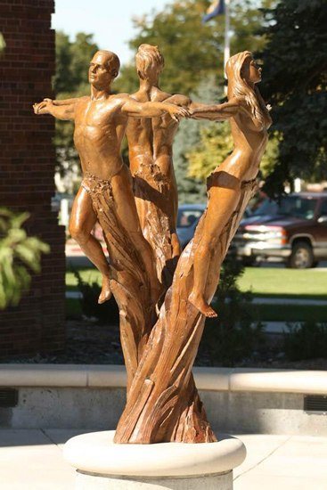 The Muses is a bronze sculpture located at Chadron State College outside Sparks Hall depicting 3 figures, 2 male and 1 female, holding hands in a triangle shape facing outward leaning away from each other. The hand holding plus the three figures being held by what appears to be wood or stone made of bronze gives the statue a y-shape feel to draw the eye up toward the figures faces. This statue is located at Chadron State College outside Sparks Hall.